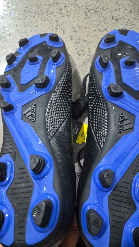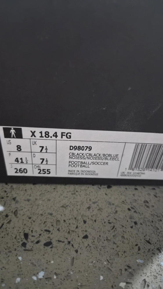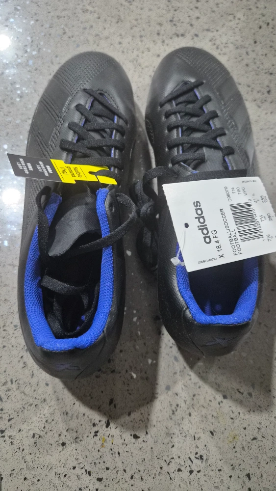 Selling a pair of Adidas X 18.4 FG soccer cleats in US size 8. They are black with blue accents.