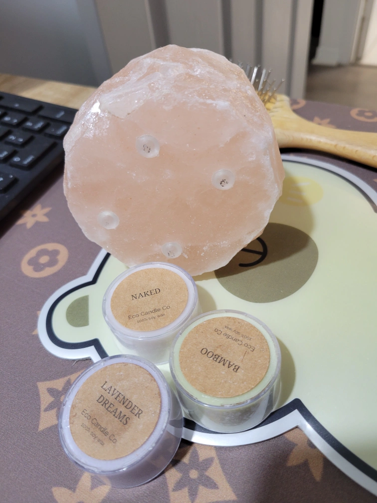 I'm selling a lovely salt candle holder from, complete with a few scented candles. It adds a warm and cozy touch to any room. The candles are made with 100% soy wax, ensuring a clean and natural burn. Perfect for creating a relaxing atmosphere!