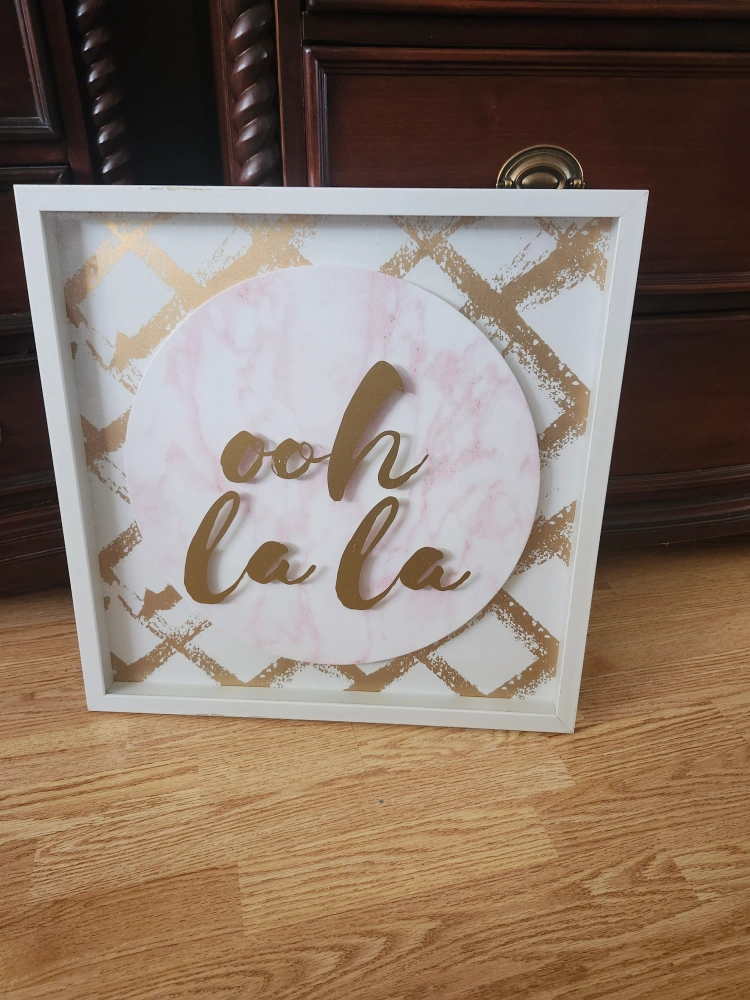 A stylish framed wall art piece featuring the phrase "Ooh La La" in gold lettering against a marble-look circle and gold cross pattern. This piece would add a touch of chic to any room!
