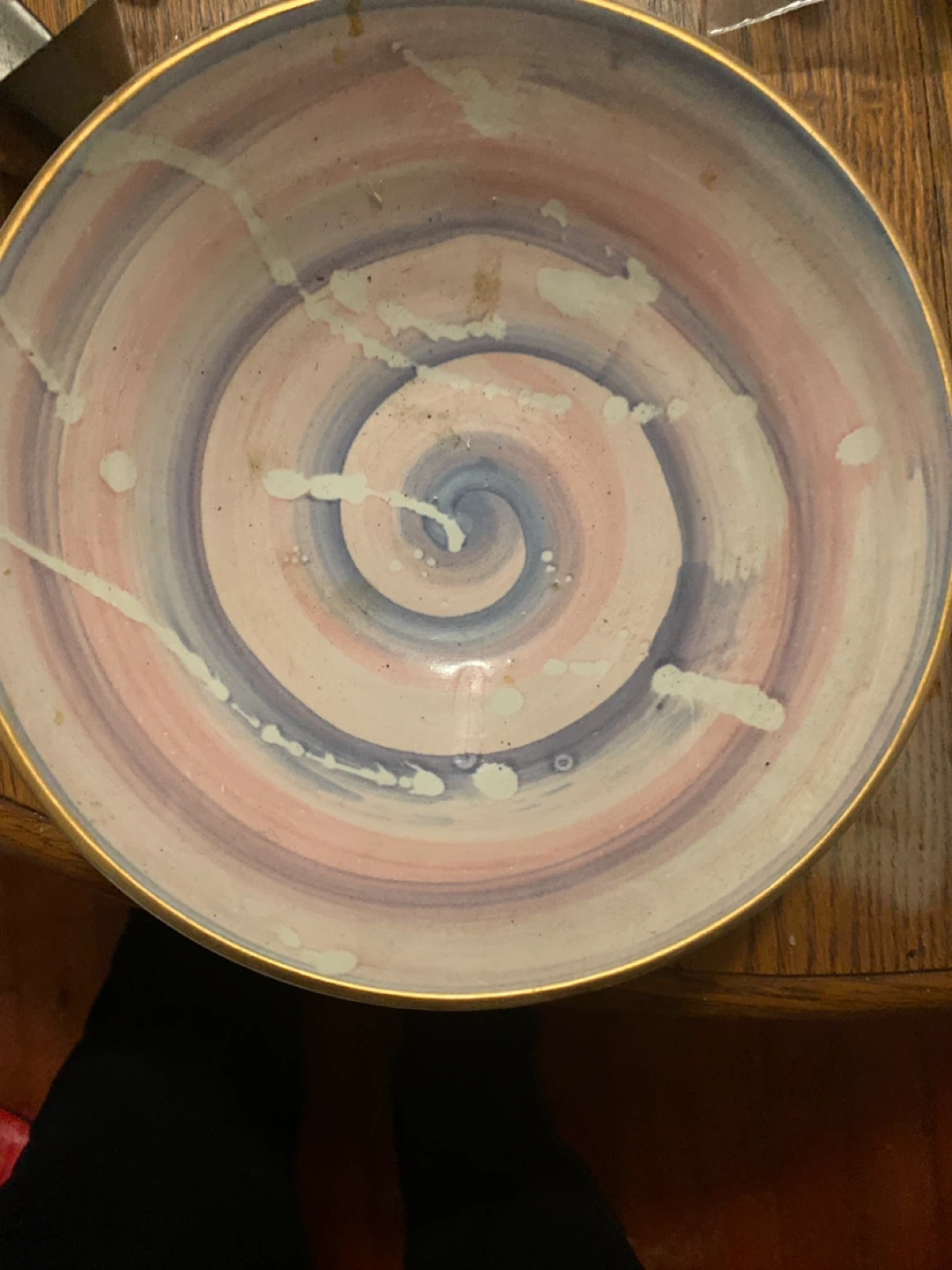Selling a decorative bowl with a unique swirl design in pink and blue. It has a gold trim around the edge. It has some white paint spots, but overall it's in good condition and would make a nice addition to any home