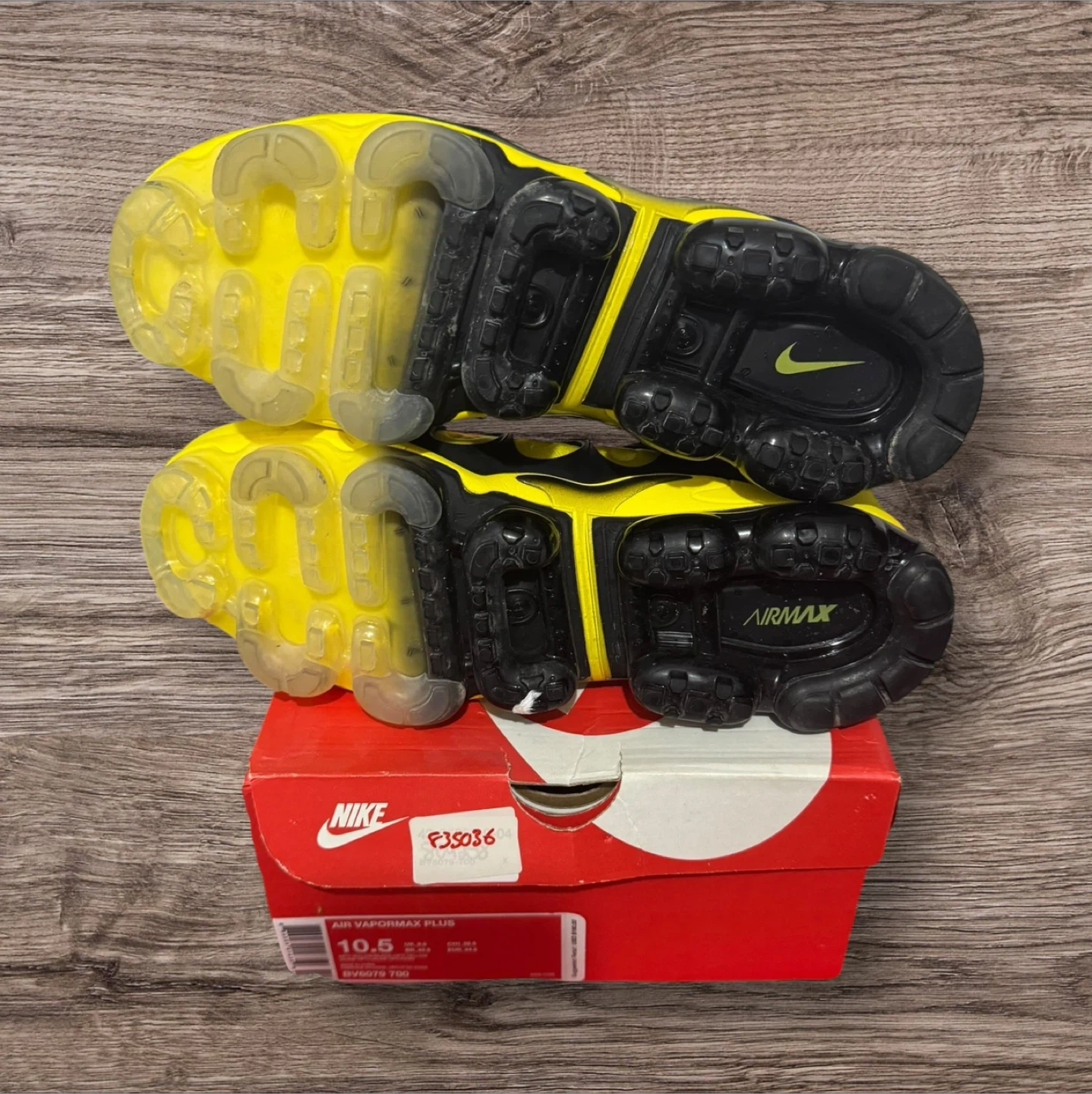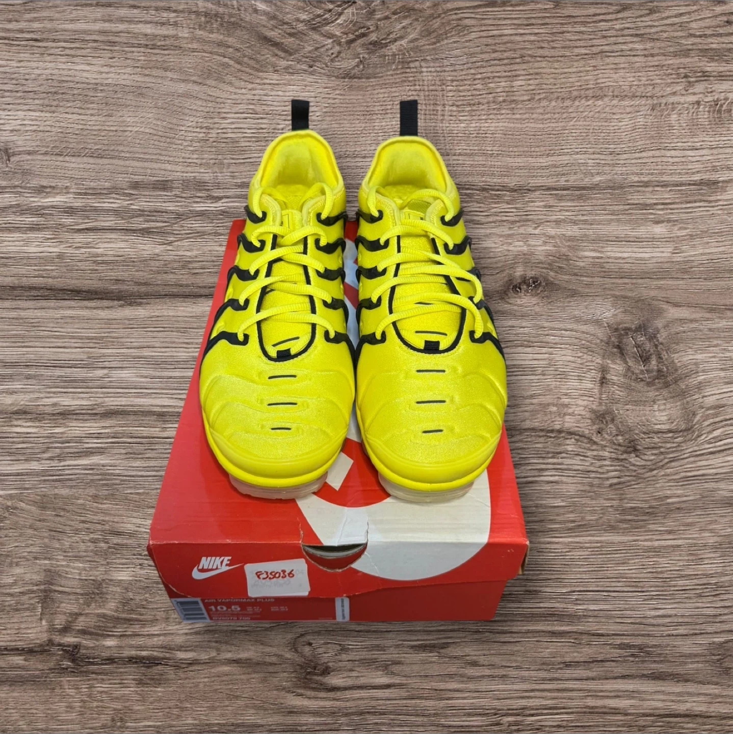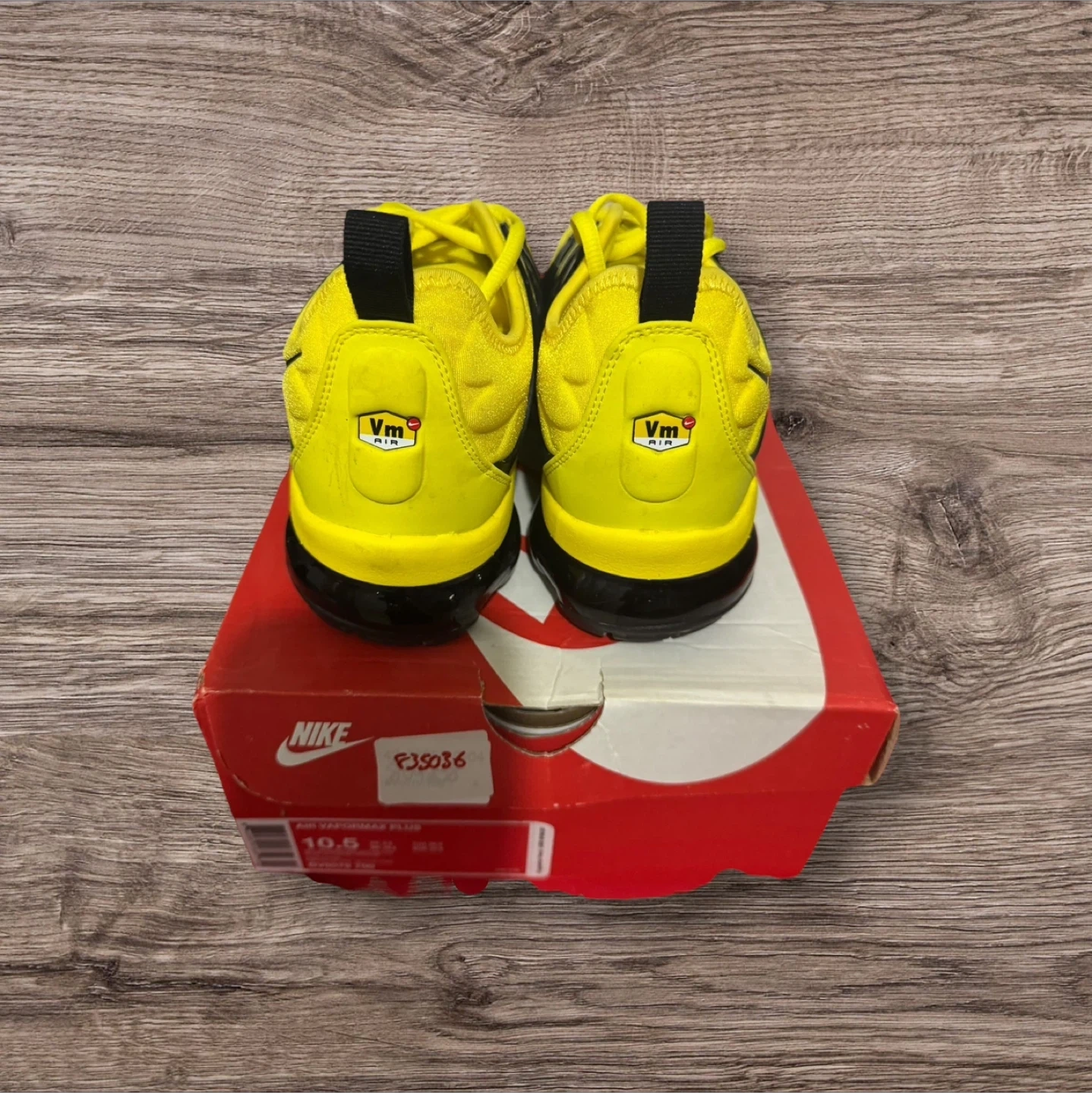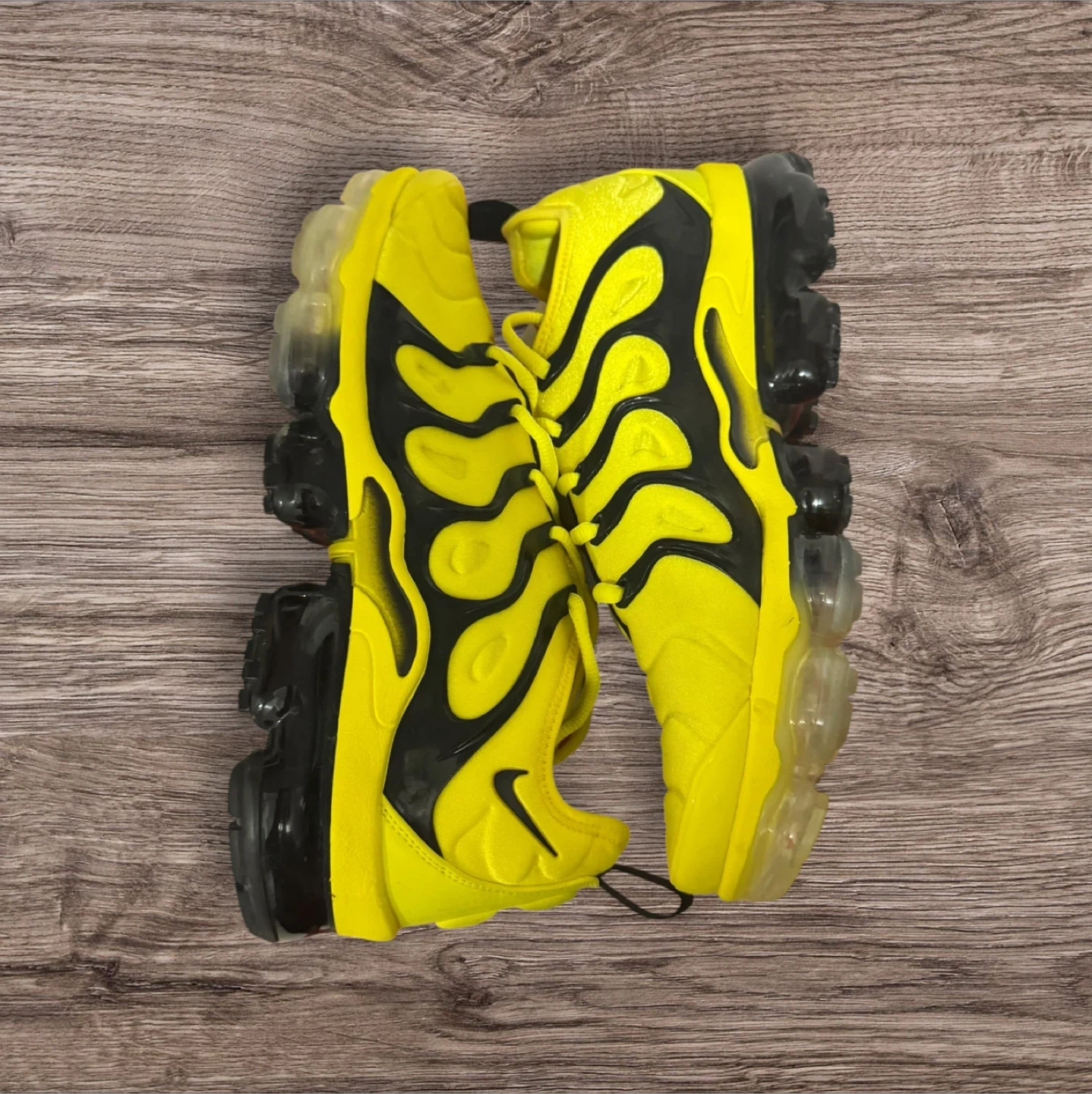 65Selling a pair of Nike Air VaporMax Plus in a vibrant yellow and black colourway! These are in great shape and come with the original box. The size is a US 10.5. A stylish and comfortable addition to any sneaker collection!