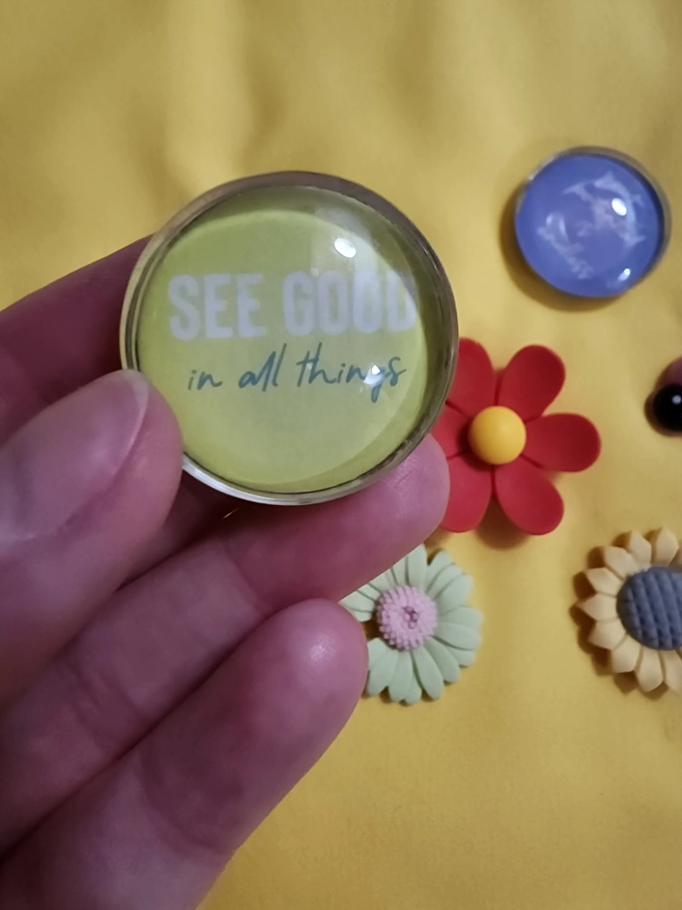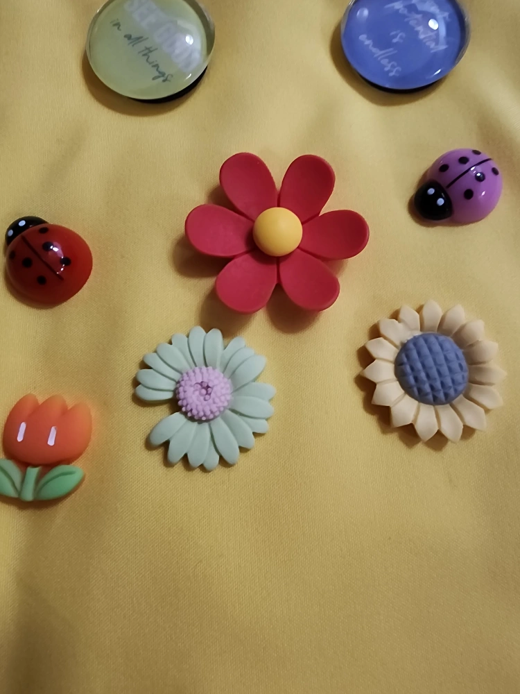 Selling a set of cute decorative fridge magnets. They feature various designs including flowers, ladybugs, and inspirational quotes under a clear dome. Perfect for adding a touch of charm to your kitchen!