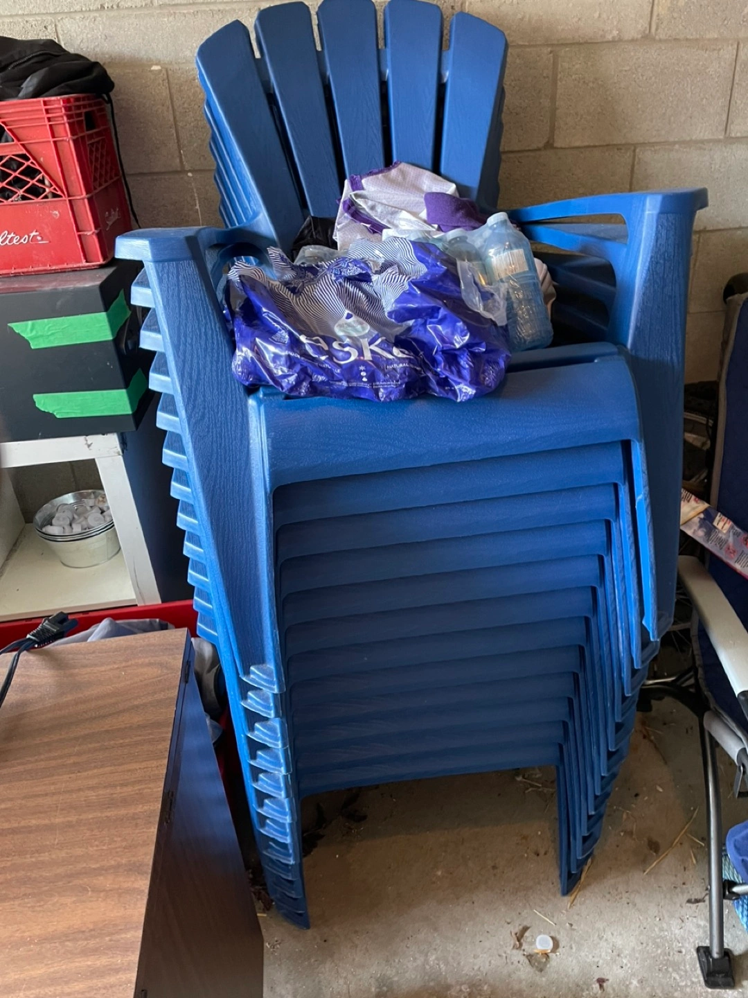 Blue Plastic full size Muskoka style chairs from CT. Purchased last fall used once now waiting for you for this summer of sunshine for 15$ each