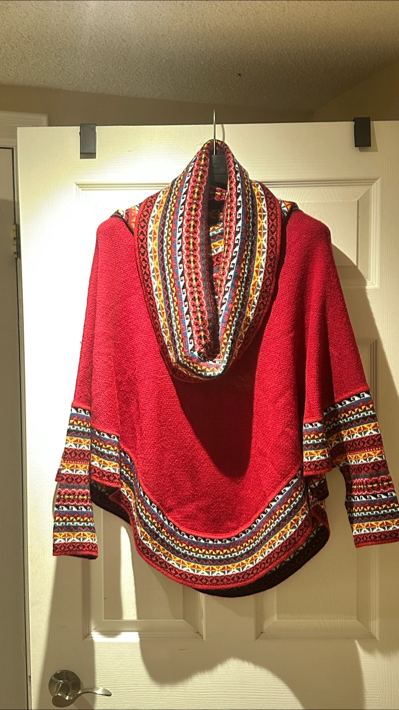 A cozy red poncho featuring a unique and colourful patterned trim around the collar, sleeves, and hem. It's in great shape and ready to add a pop of colour to your wardrobe!