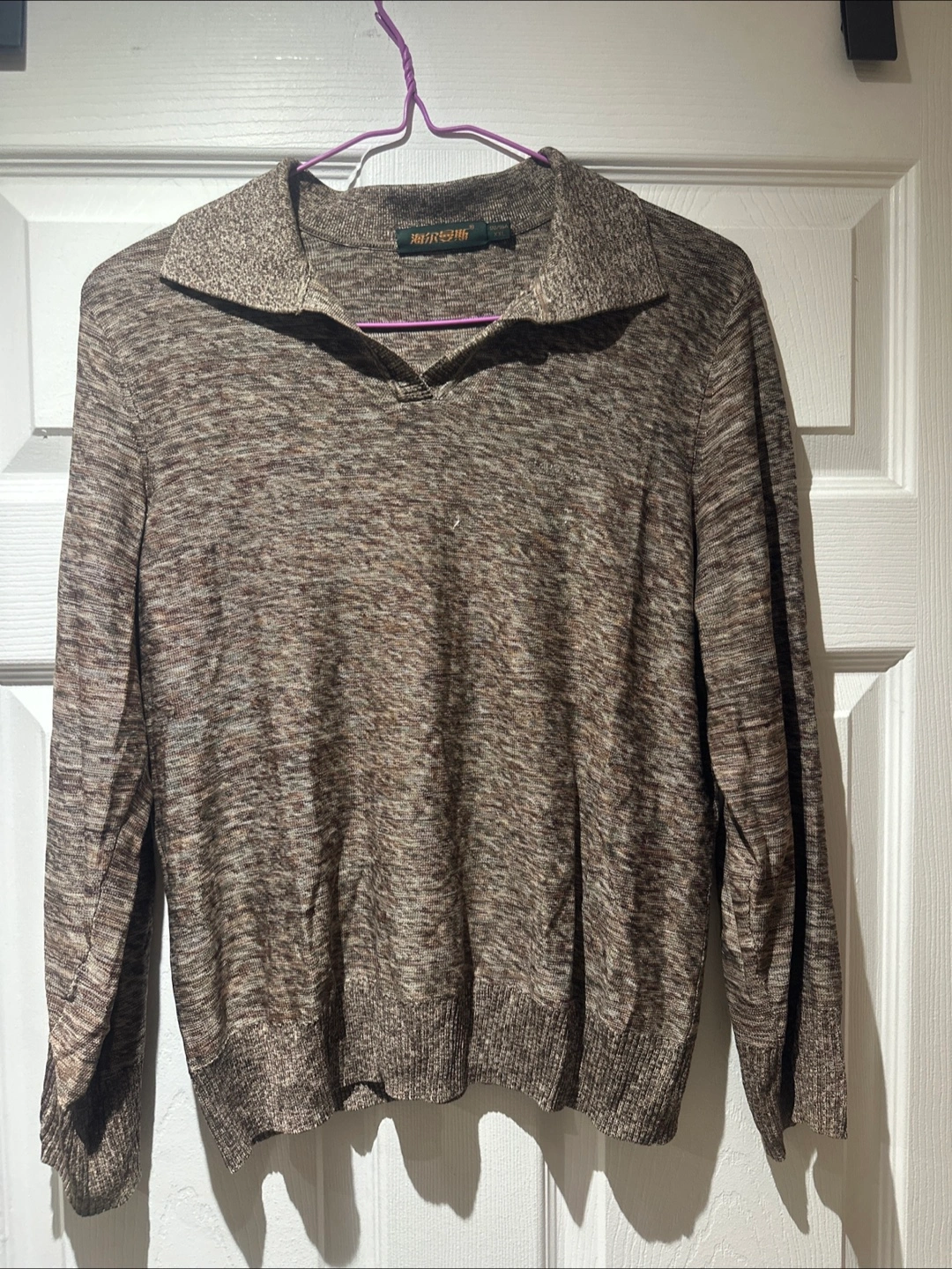This is a brown knit long sleeve shirt. It looks like it's in good condition!