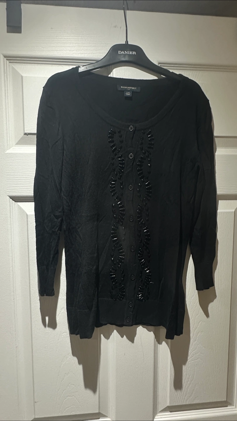 A lovely black cardigan from Banana Republic. It's a size small and features a decorative beaded design down the front. Perfect for layering or dressing up an outfit!