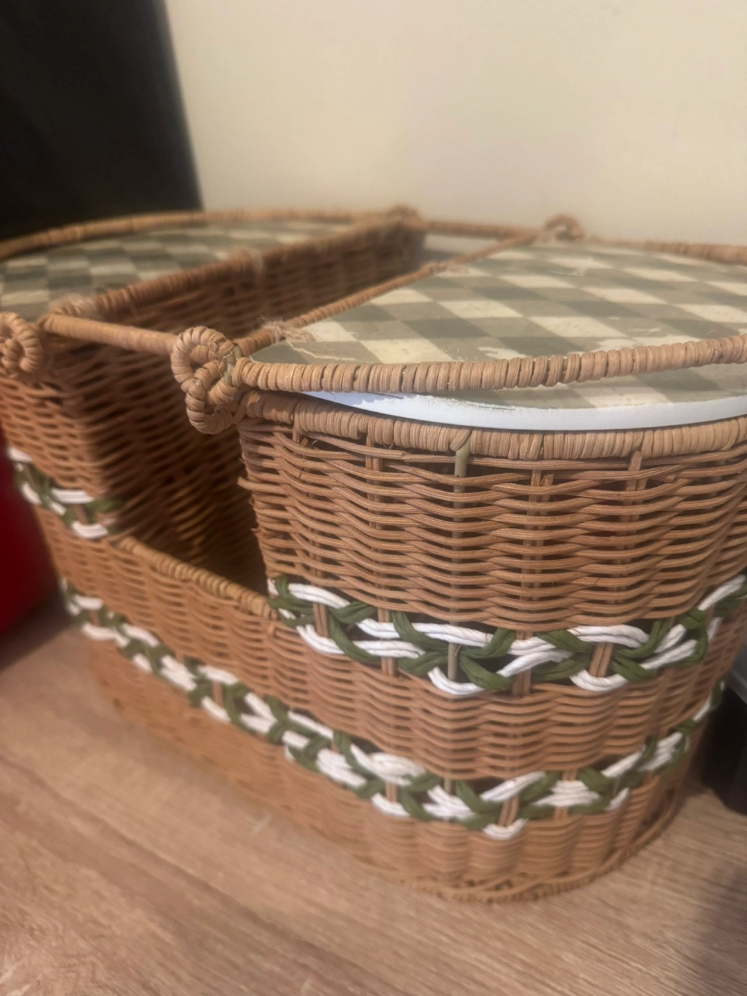 Selling a wicker basket with a unique checkerboard lid! It's in great shape and would be perfect for storage or decor in your home. The basket features woven detailing with a white and green accent.
