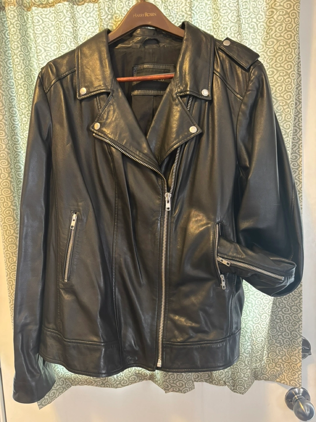 Classic biker style leather jacket. Butter soft leather. Satin lined. It is a stylish piece that can be dressed up or down. Worn 10 times, it is like new. Non-smoker. Paid $400. Fit is generous.