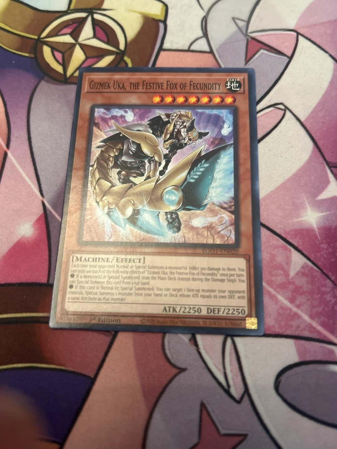 Selling a Gizmek Uka, the Festive Fox of Fecundity card! It's a Machine/Effect monster card with ATK/2250 and DEF/2250. A great addition to any Yu-Gi-Oh! collection
