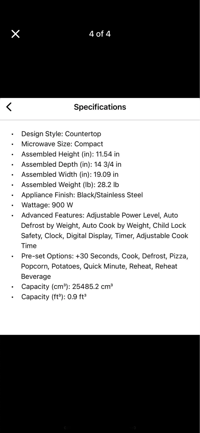 Compact countertop microwave oven with 900 watts of power. YWMH31017HS - 2, It has a 0.9 cu ft capacity with pre-set options like Cook, Defrost, Pizza, and Popcorn. Features include adjustable power level, auto defrost, child lock, clock, and digital display.