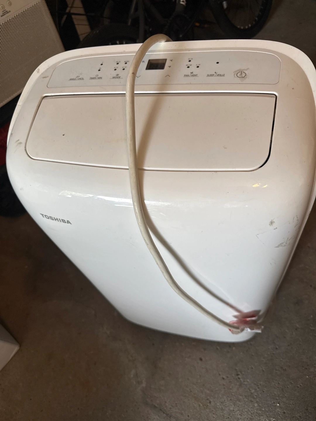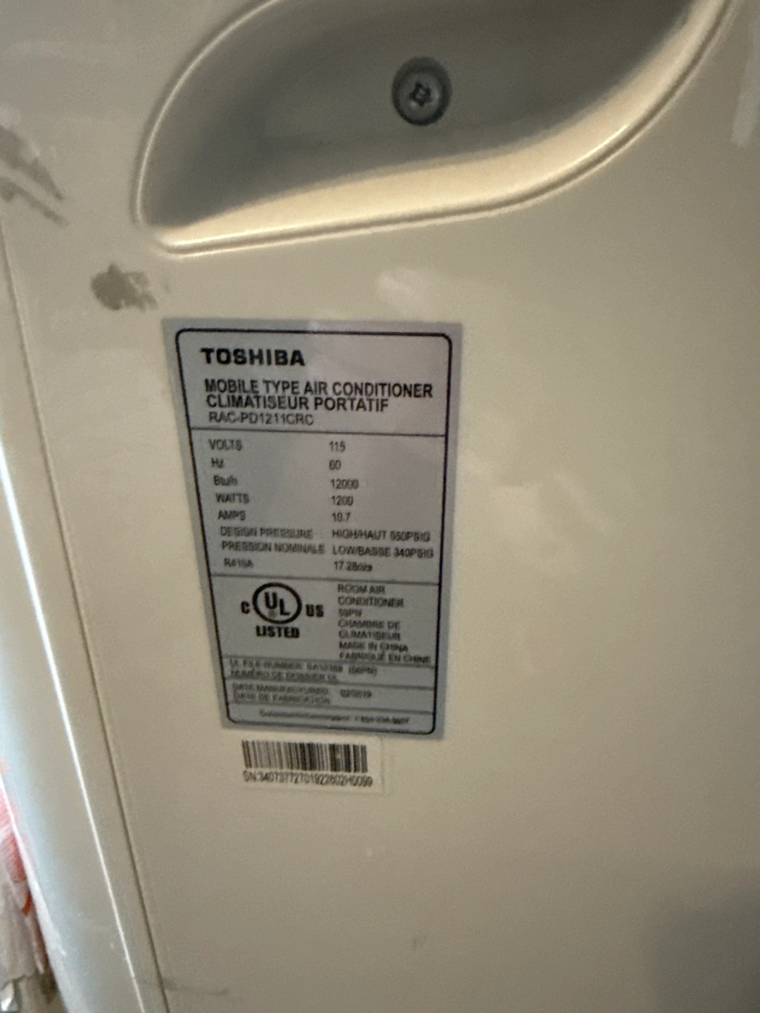 Selling a Toshiba mobile type air conditioner, model RAC-PD1211CRC. It operates at 115 volts and 60 Hz, with a power consumption of 1200 watts and a current of 10.7 amps. It uses R410A refrigerant. It is a room air conditioner.