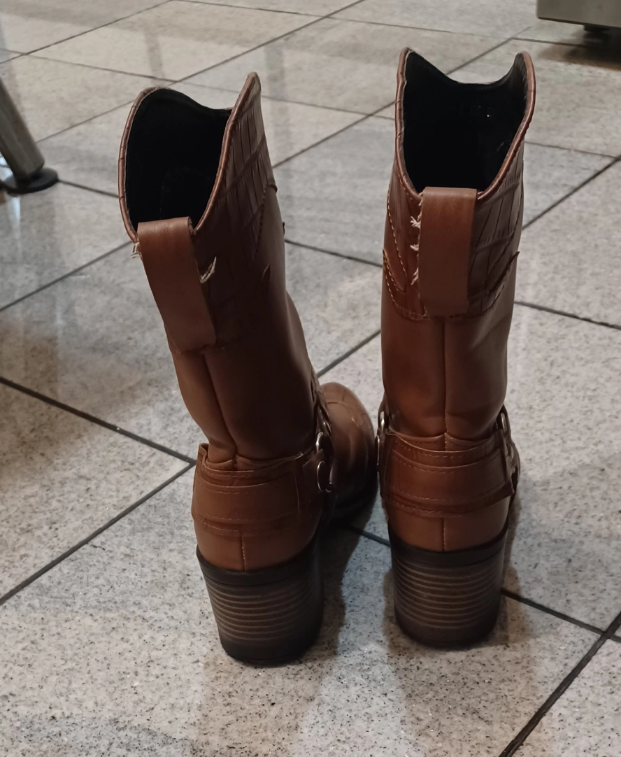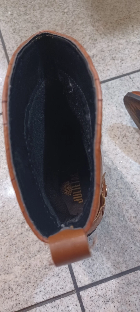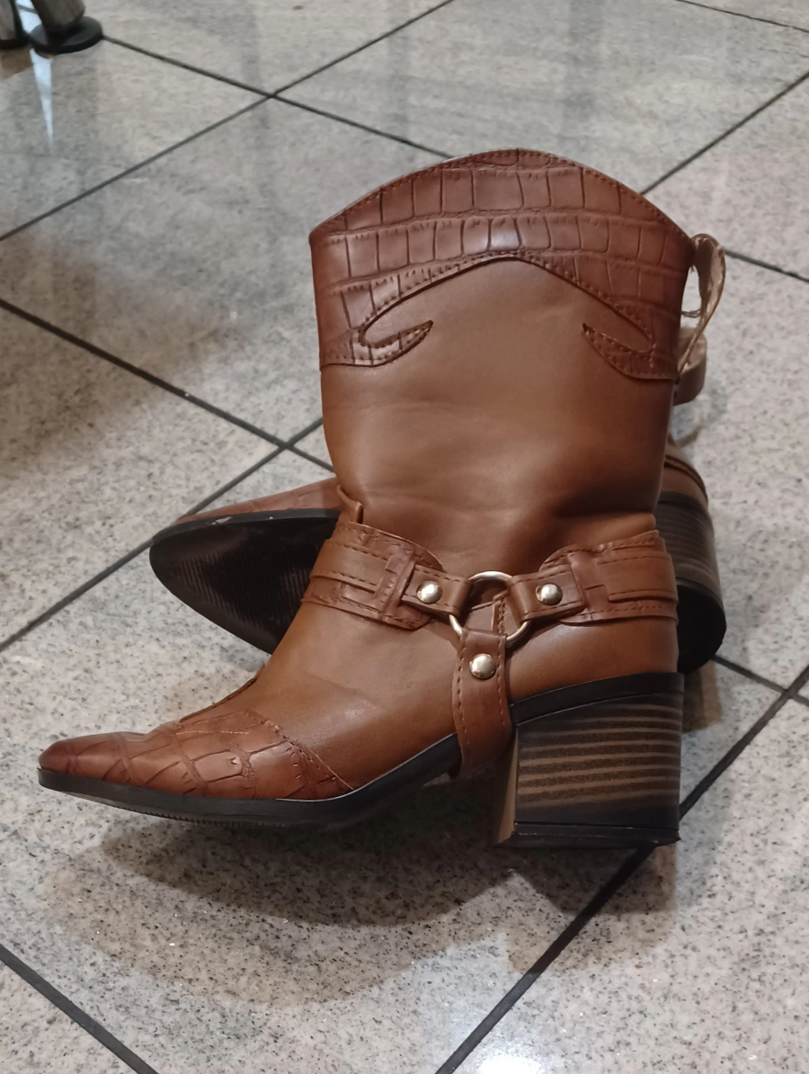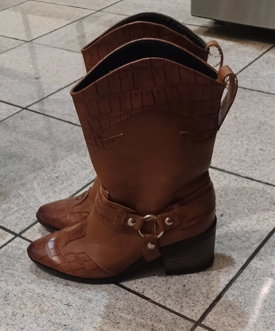 486These are a pair of brown leather cowboy boots from Julietta! They have a unique design with a block heel and some detailing around the ankle. They're in great shape.Size 7.