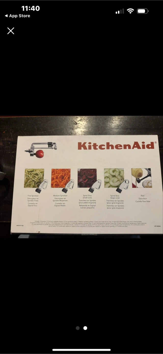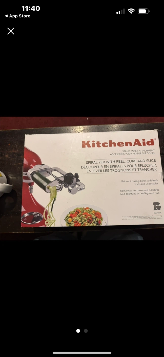I'm selling a KitchenAid spiralizer attachment that can peel, core, and slice your veggies! It's compatible with KitchenAid stand mixers and comes with multiple blades for different spiral sizes