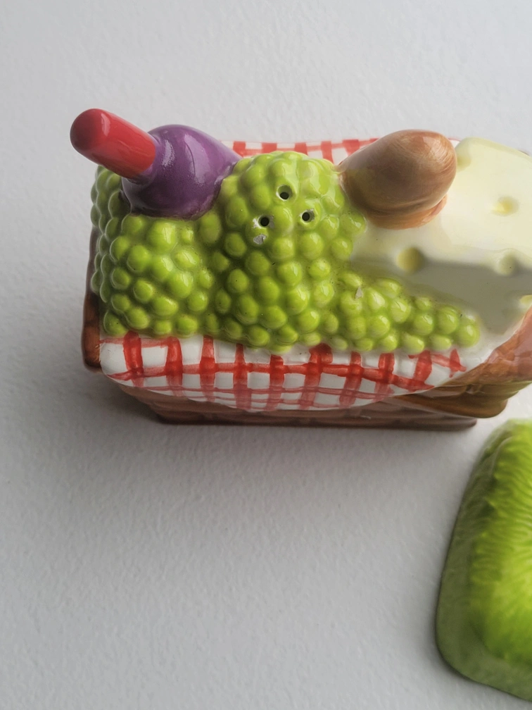 The picnic basket shaker is Salt with the holes for dispensing the seasoning visible on the top.