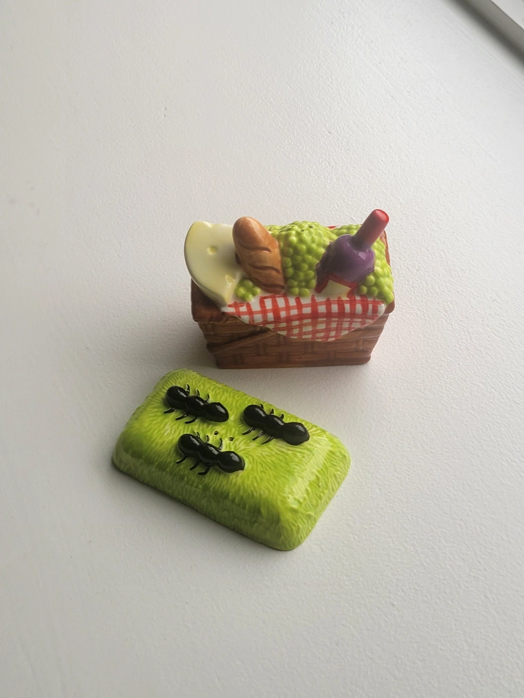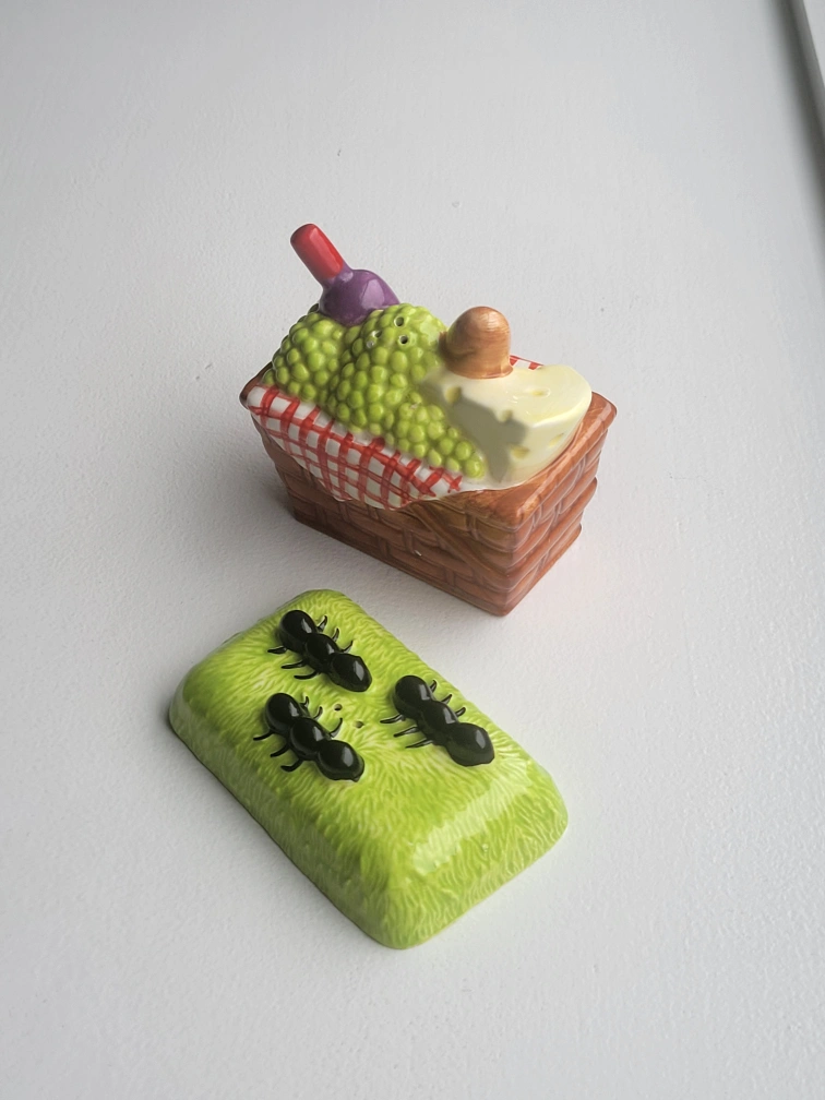 The set includes two shakers: one shaped like a picnic basket with food items (cheese, bread, grapes, wine bottle) and another shaped like a patch of grass with three ants on it.