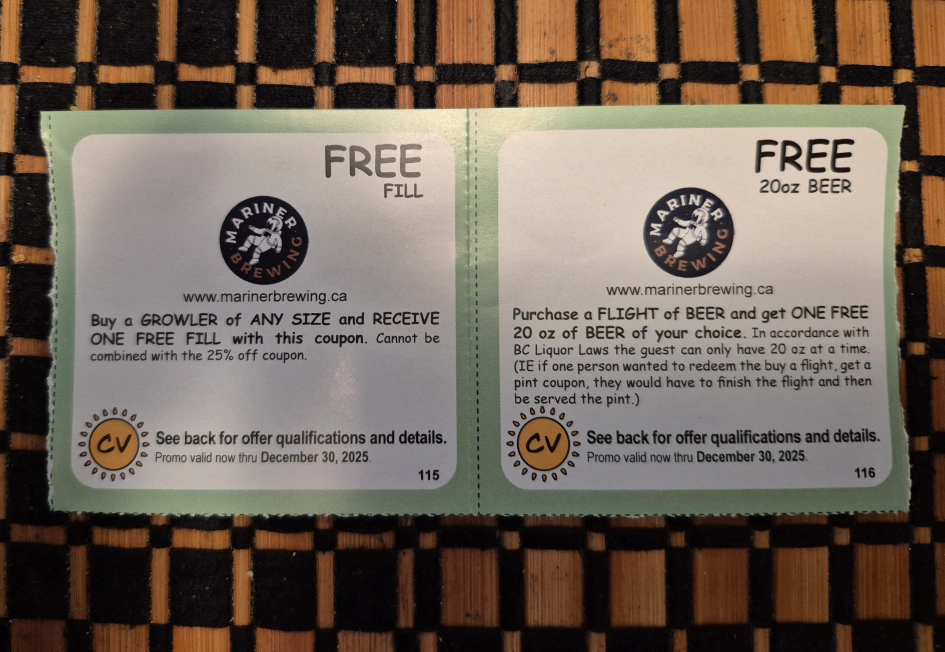 Two coupons for Mariner Brewing! One is for a free growler fill of any size, and the other is for a free 20oz beer with the purchase of a flight. Both coupons are valid until December 30, 2025