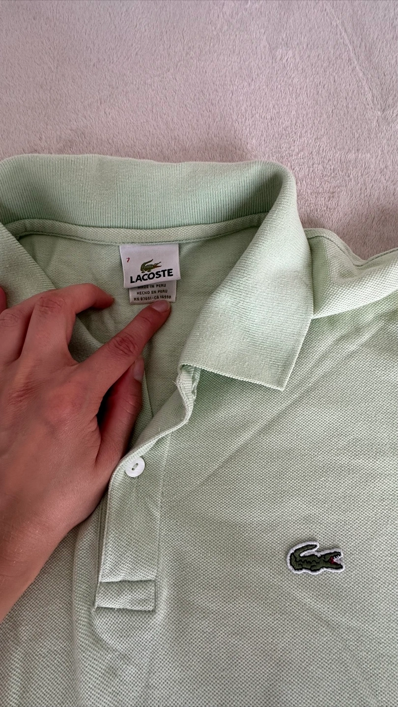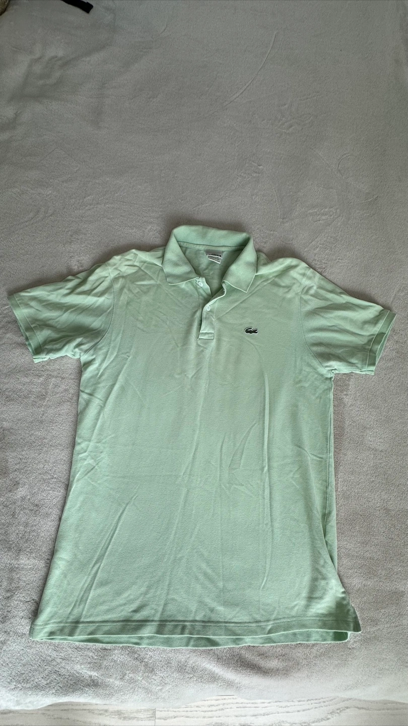Selling a Lacoste polo shirt in a refreshing light green colour! It's a size 7, which is equivalent to a large. The shirt features the iconic Lacoste crocodile logo. A classic and comfortable piece for your wardrobe!
