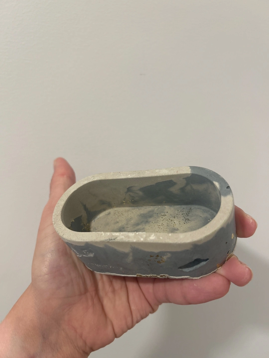 Handmade concrete oval planter. Grey and beige marbled effect and gold leafaccents. Perfect for small succulents or trinkets!
