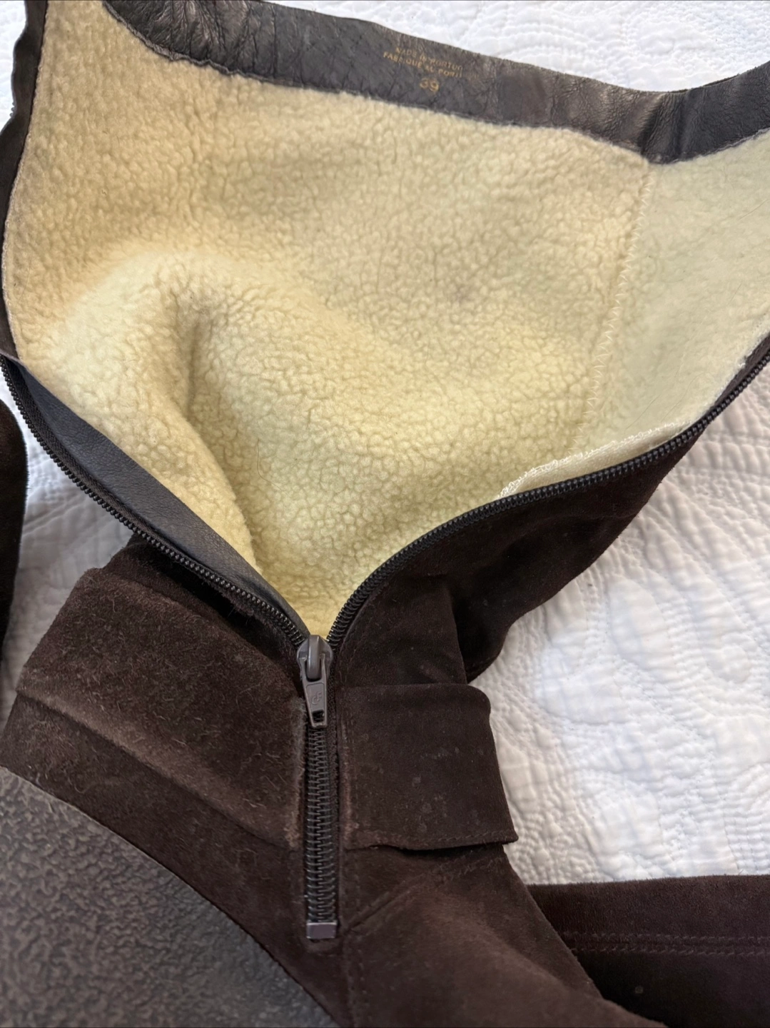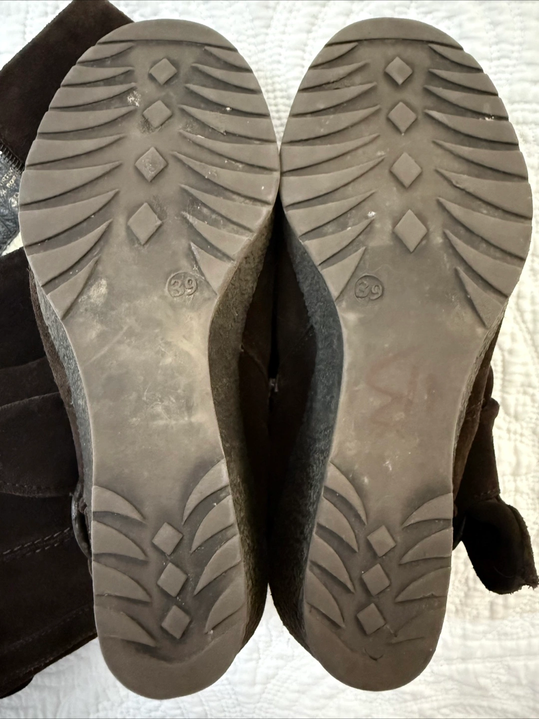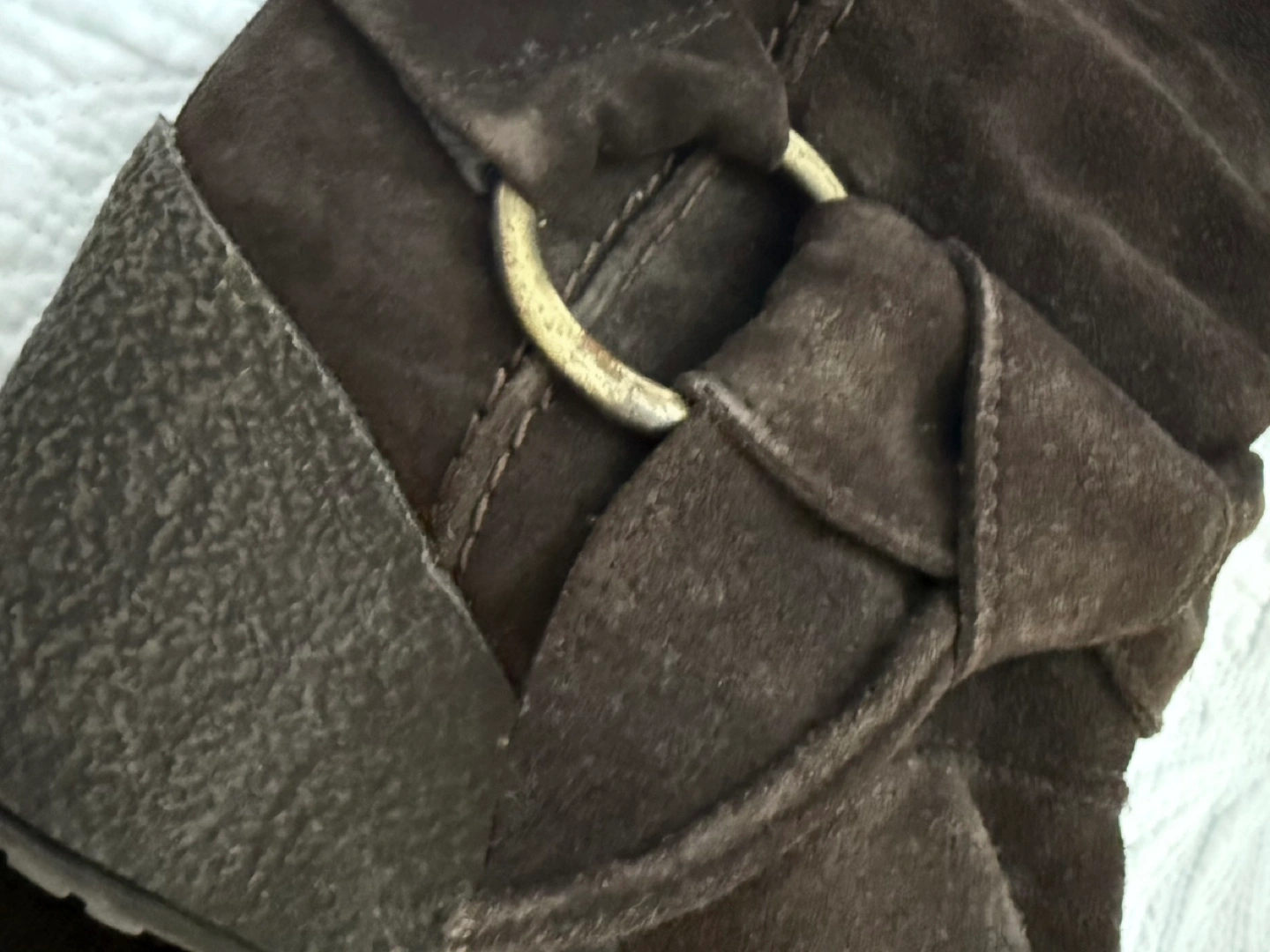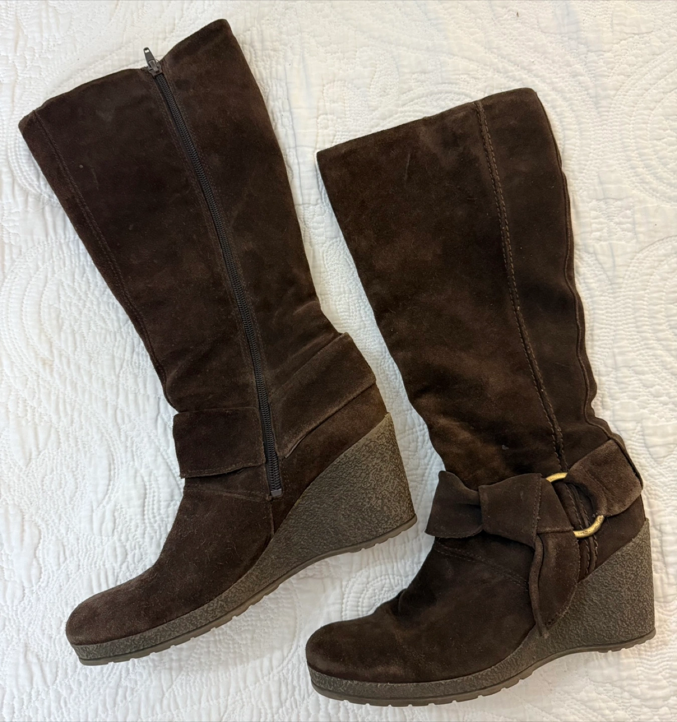 442These are a pair of stylish brown suede knee high wedge boots. They feature a zip closure and a cute bow detail. Perfect for adding a touch of flair to your fall or winter outfits!