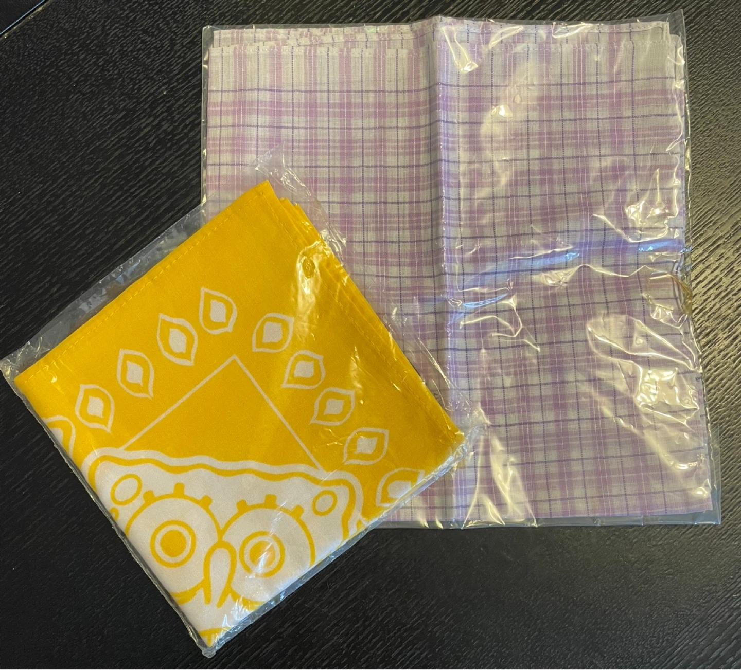 Two bandanas for giving away! One is a vibrant yellow with a cool pattern, and the other is a classic purple plaid. Both are brand new and still in their original packaging