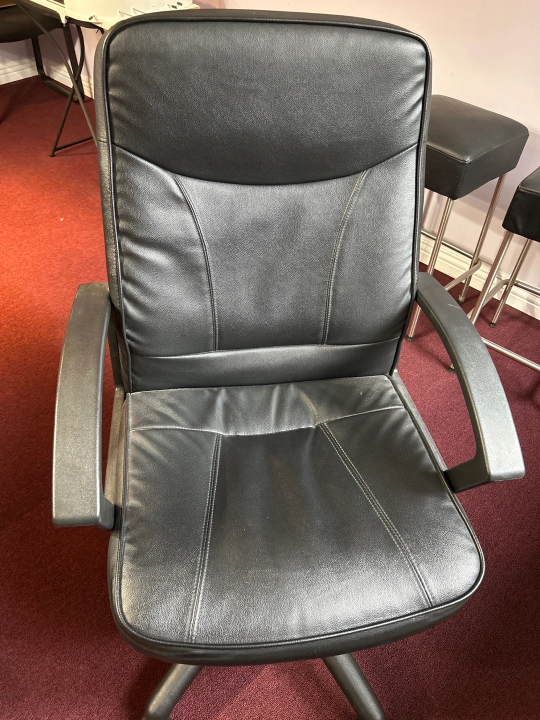 Selling a black office chair. It's in good condition and ready for a new home office or workspace. Perfect for anyone needing comfortable seating during long work hours