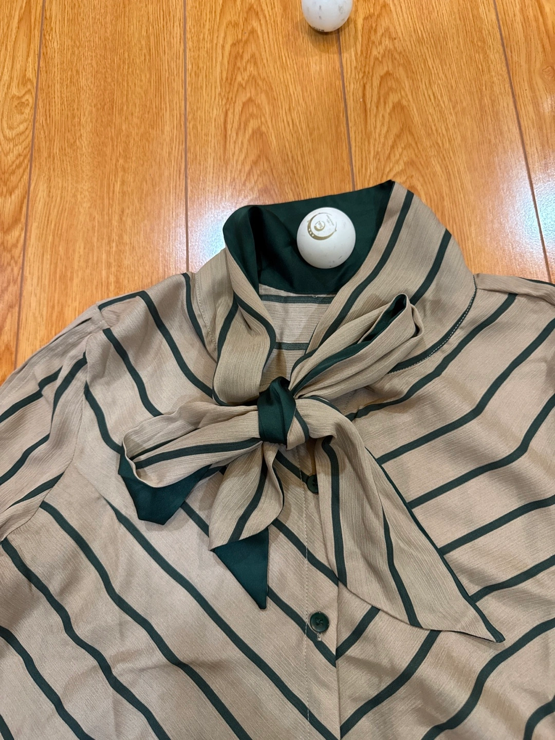 This is a stylish striped blouse featuring a unique bow detail at the collar. The stripes are a combination of beige and a darker green, giving it a sophisticated look. It would be a great addition to any wardrobe!