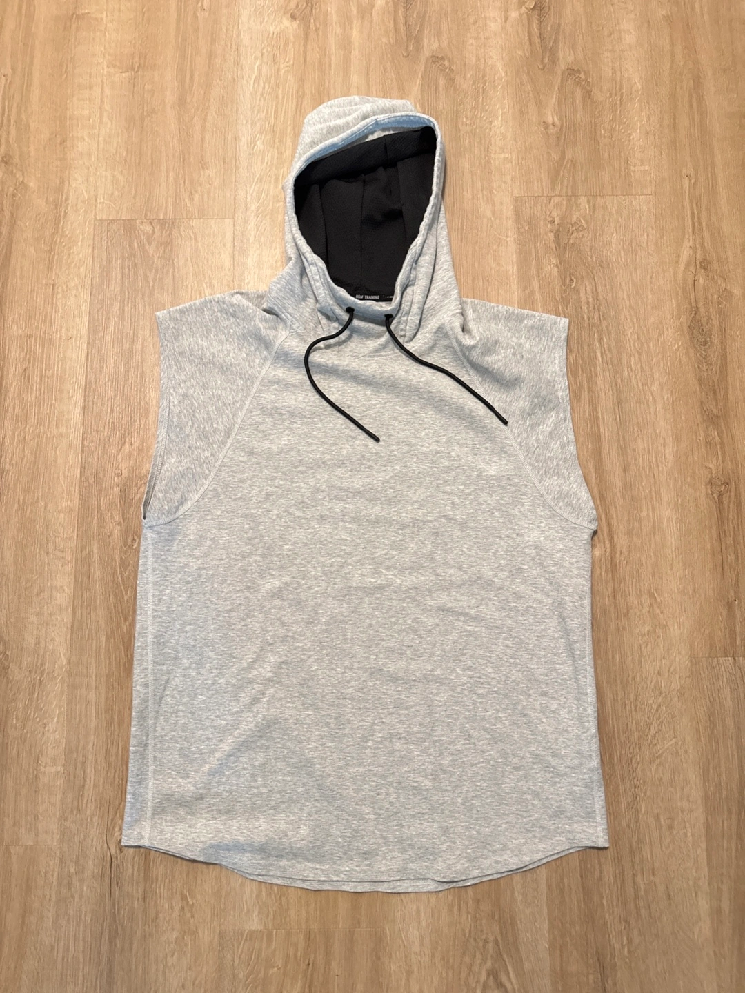 Here's a comfy sleeveless hoodie in a nice light grey colour! It's in great shape and ready for a new home. Perfect for layering or just lounging around the house