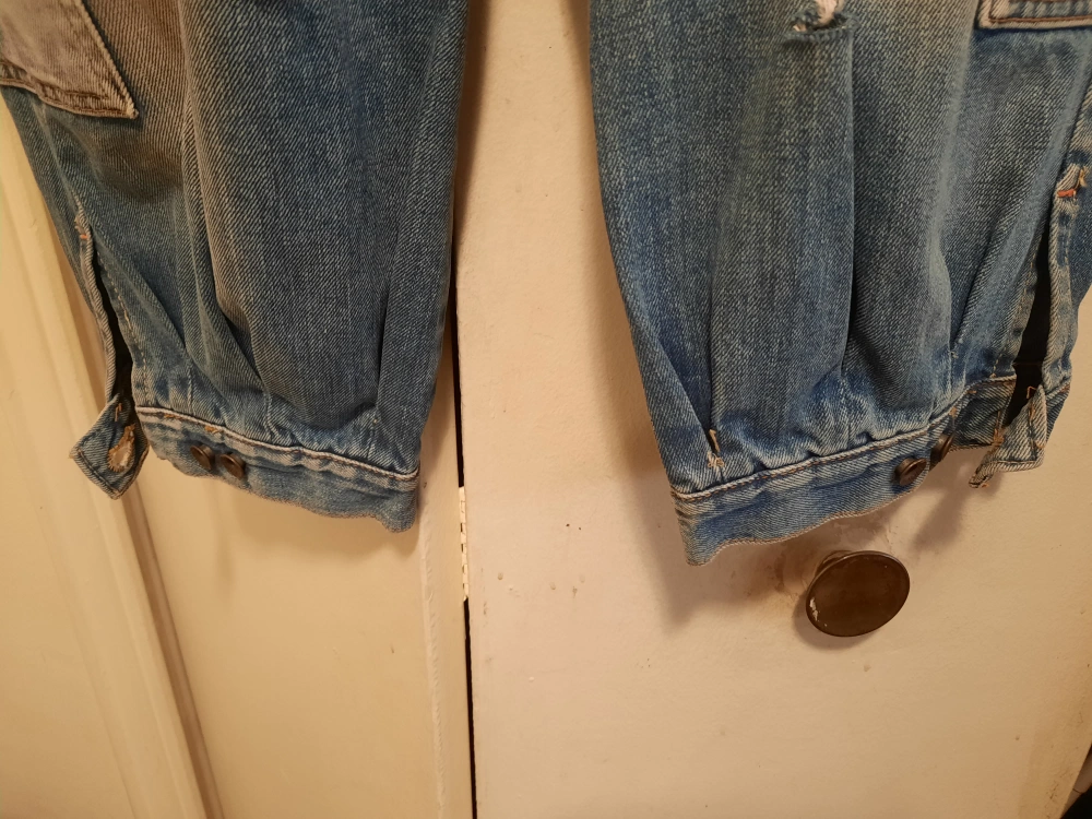 Unique denim capris with a distressed patchwork design! These have a cool, vintage vibe with lots of interesting details. Perfect for adding some edge to your wardrobe