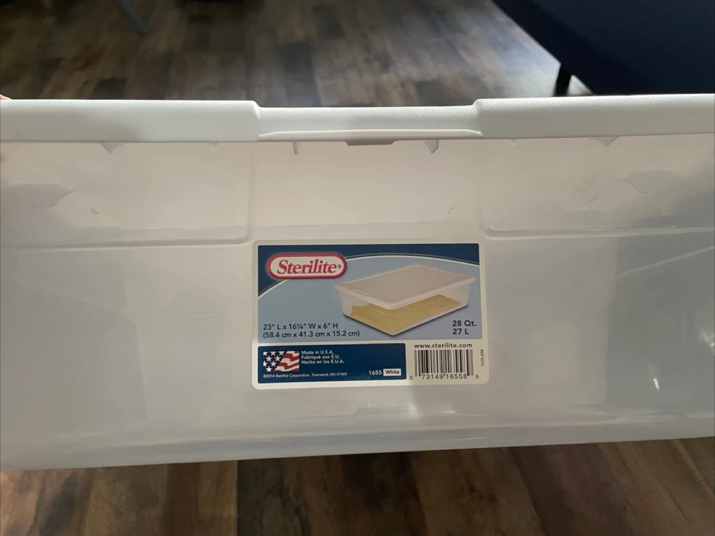 Selling a Sterilite 28 Qt storage tote in white. It measures 23" L x 16 1/8" W x 6" H (58.4 cm x 41.3 cm x 15.2 cm). Great for organizing your belongings!