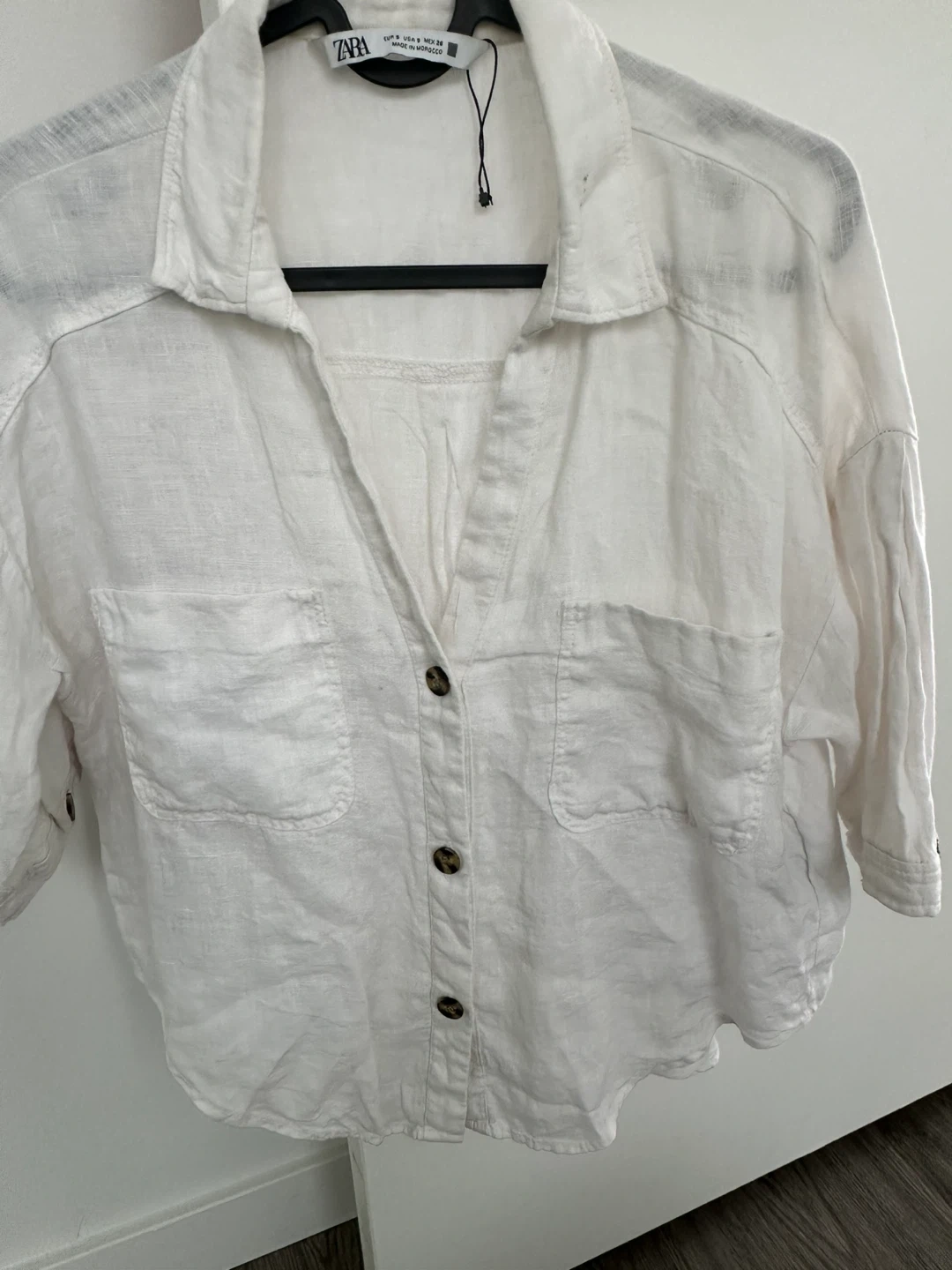 Selling a Zara white linen shirt in size S. It's in great condition and perfect for warmer weather! The shirt has a classic button-down style with a relaxed fit.