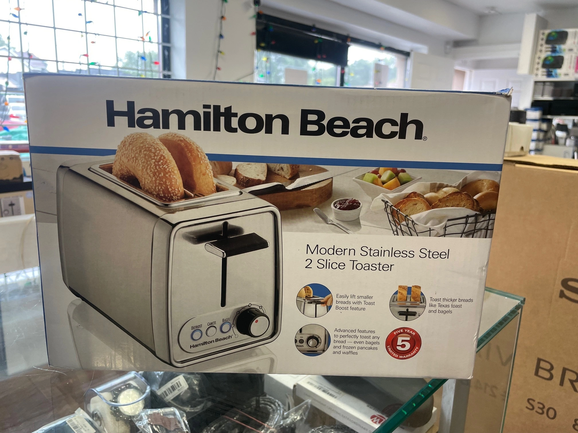 This Hamilton Beach 2-slice toaster offers up handy one-touch smart functions for reheat, defrost, bagel, and cancel. Unique built-in bagel technology toasts the cut side of the bagel while gently warming the rounded side for the perfect bagel, while dual control allows two different toasting selections at the same time.