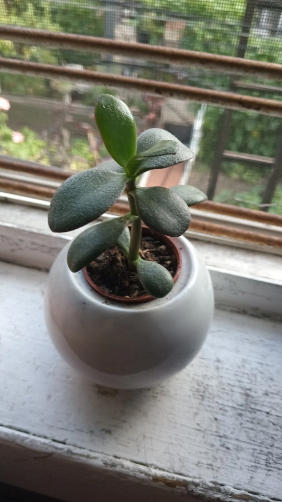 Healthy jade plant in a cute, round white pot! It's perfect for adding a touch of greenery to any space. The plant is well-established and easy to care for, making it a great addition to your home or office