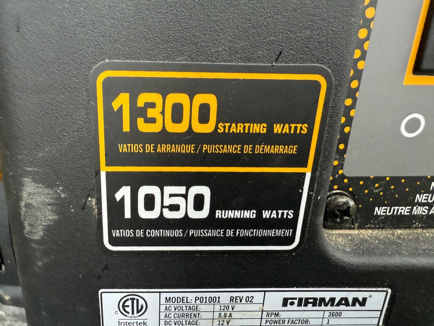 Selling a Firman generator with 1050 running watts and 1300 starting watts. It has a 1.3-gallon tank and can run up to 9 hours at 50% load. The model number is P01001.