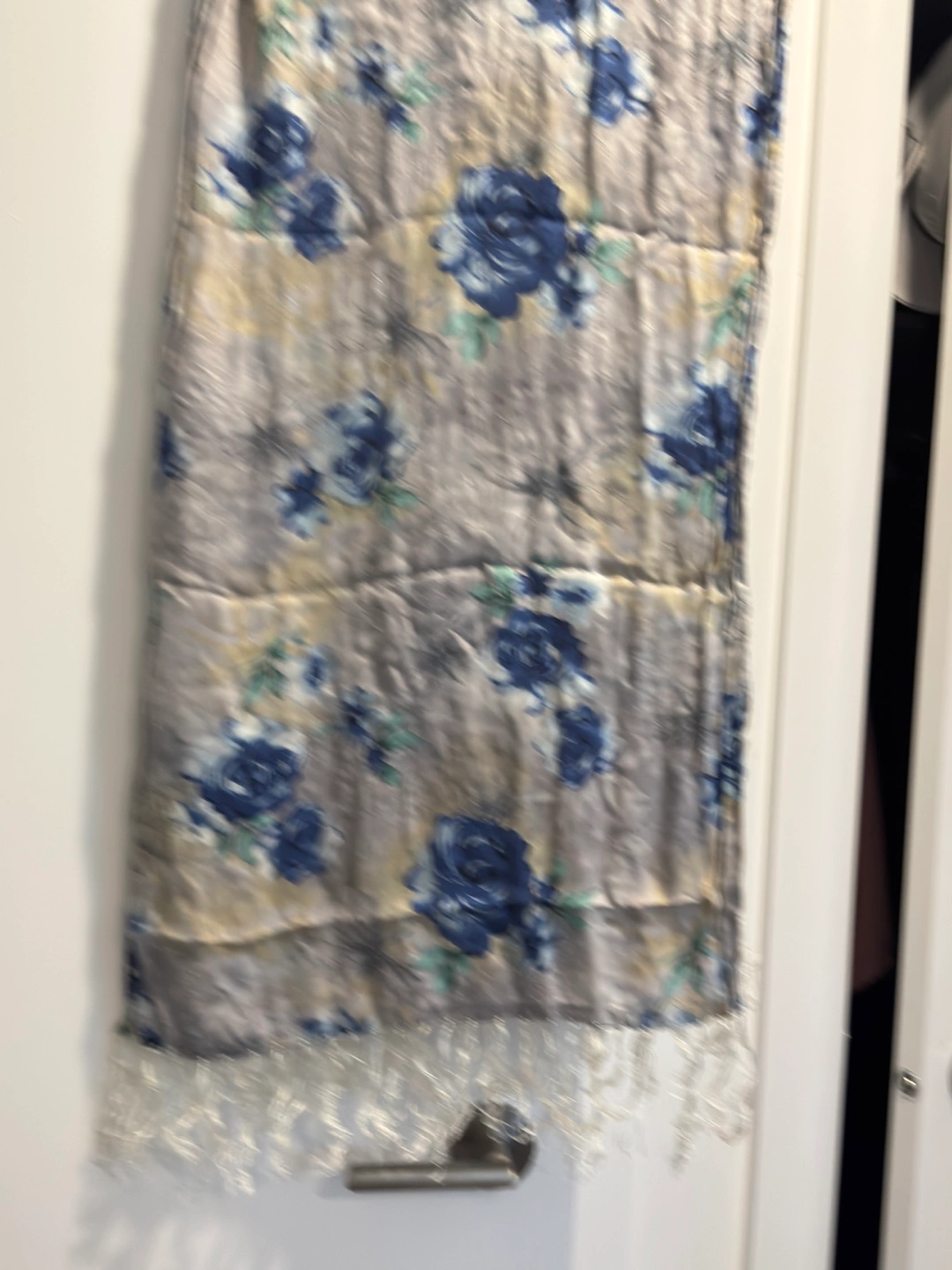 A lovely floral scarf featuring a beautiful blue and grey pattern. It's in great condition and ready to add a touch of elegance to your outfit. Perfect for any season!