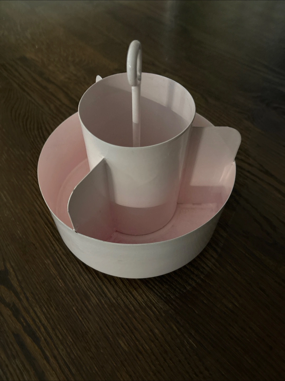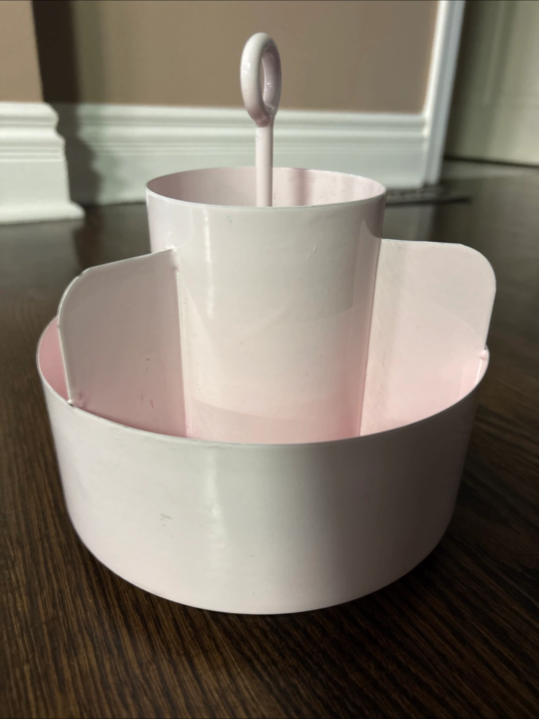 Here's a cute pink organizer caddy! It's perfect for keeping your desk or vanity tidy. It has a unique design with a central cup and surrounding compartments. It's in great condition and ready for a new home!