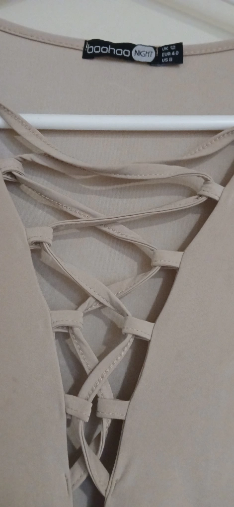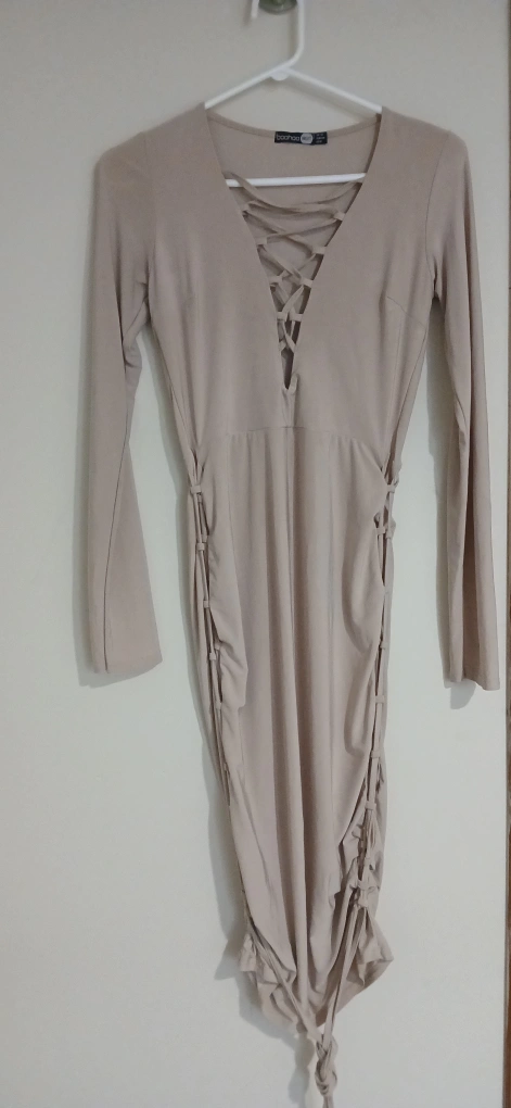 Selling a Boohoo Night dress in a lovely beige colour! It's a size 8 and features a stylish lace-up front. The dress has long sleeves and a flattering silhouette. Perfect for a night out or a special occasion!