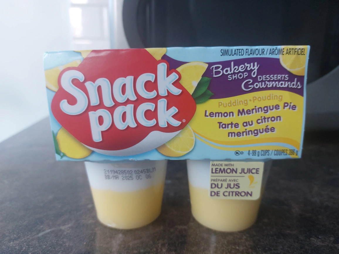 6963 left of 4-pack of Snack Pack lemon meringue pie pudding cups. These are perfect for a quick and tasty treat. Expiry Date: 2025 October 06 Pickup only unless bundled with another item of $5 or more.