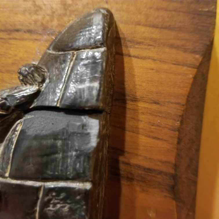 mounted on a wooden base. It depicts a traditional scene. It's a unique piece of art that would look great in any home!