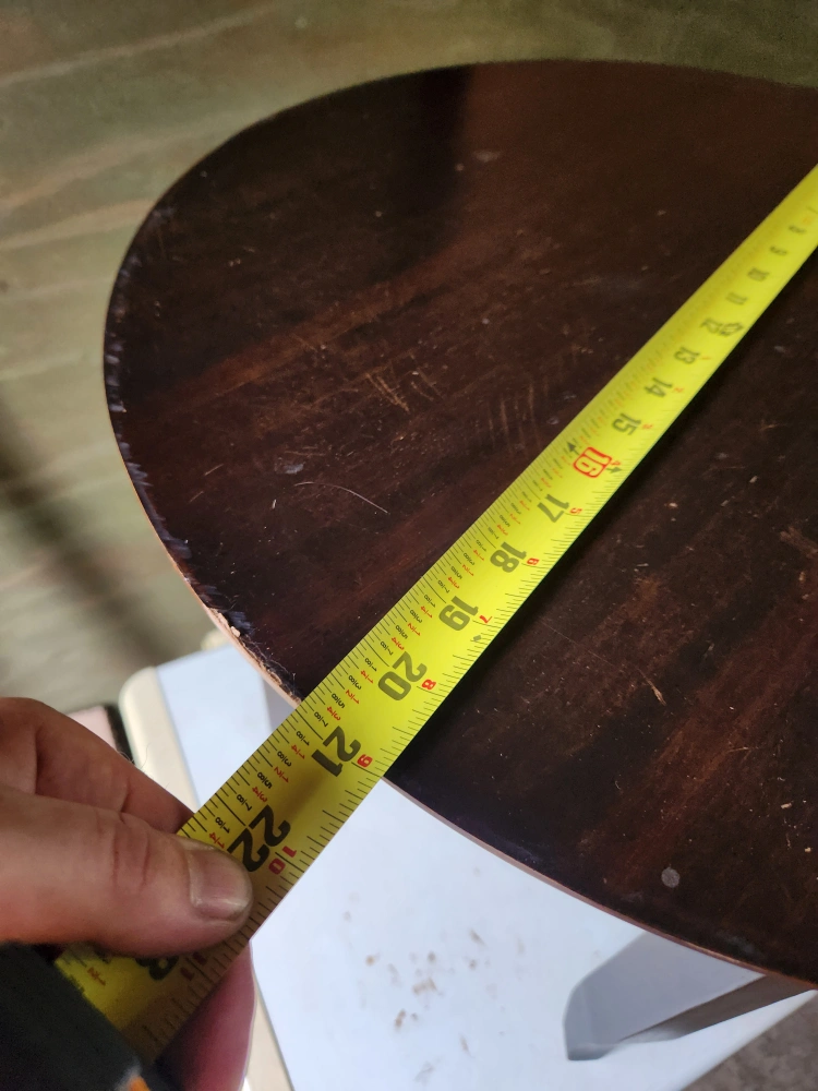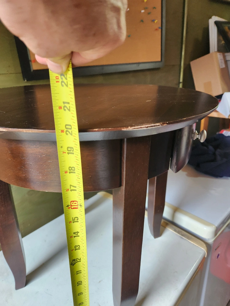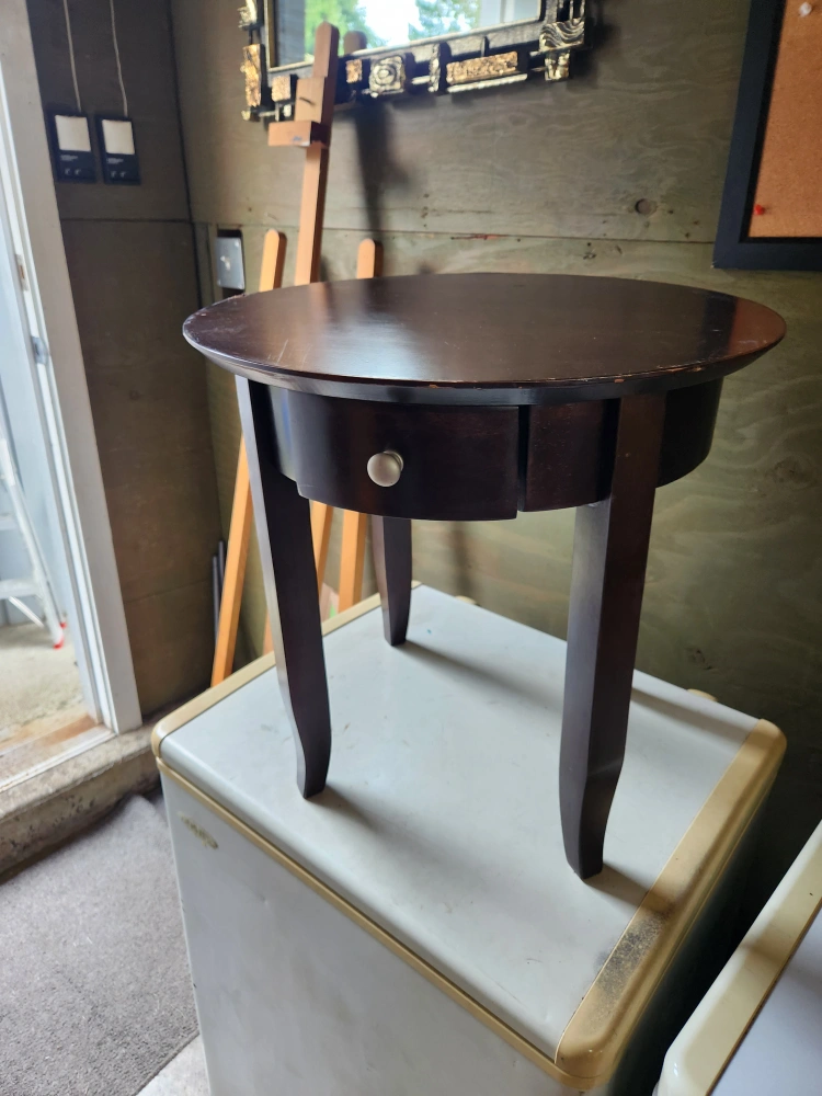 Selling a dark brown round side table. It's a lovely piece to add to any room. The table has a drawer for storage. The table top is approximately 21 inches in diameter and the table stands about 22 inches tall