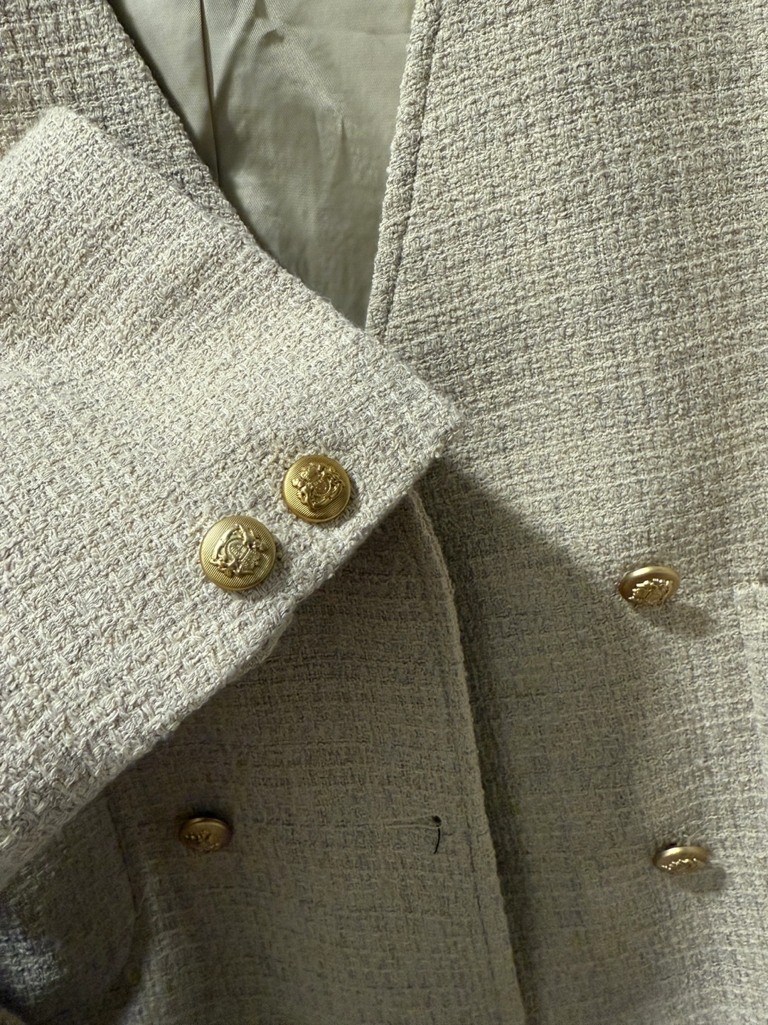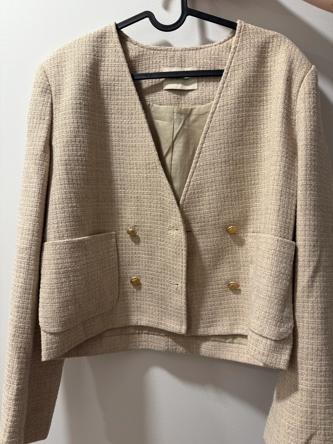 This is a Fifteen Moon tweed jacket in a beige colour. It features a double-breasted design with gold-tone buttons and two front pockets. Perfect for adding a touch of sophistication to any outfit!