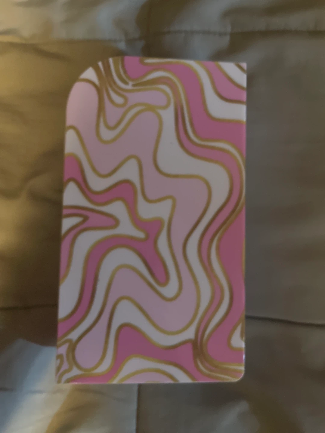 I'm selling a cute desk organizer with a pink and gold swirl pattern! It has several compartments to keep your desk tidy and stylish. Perfect for holding pens, makeup brushes, or other small items!