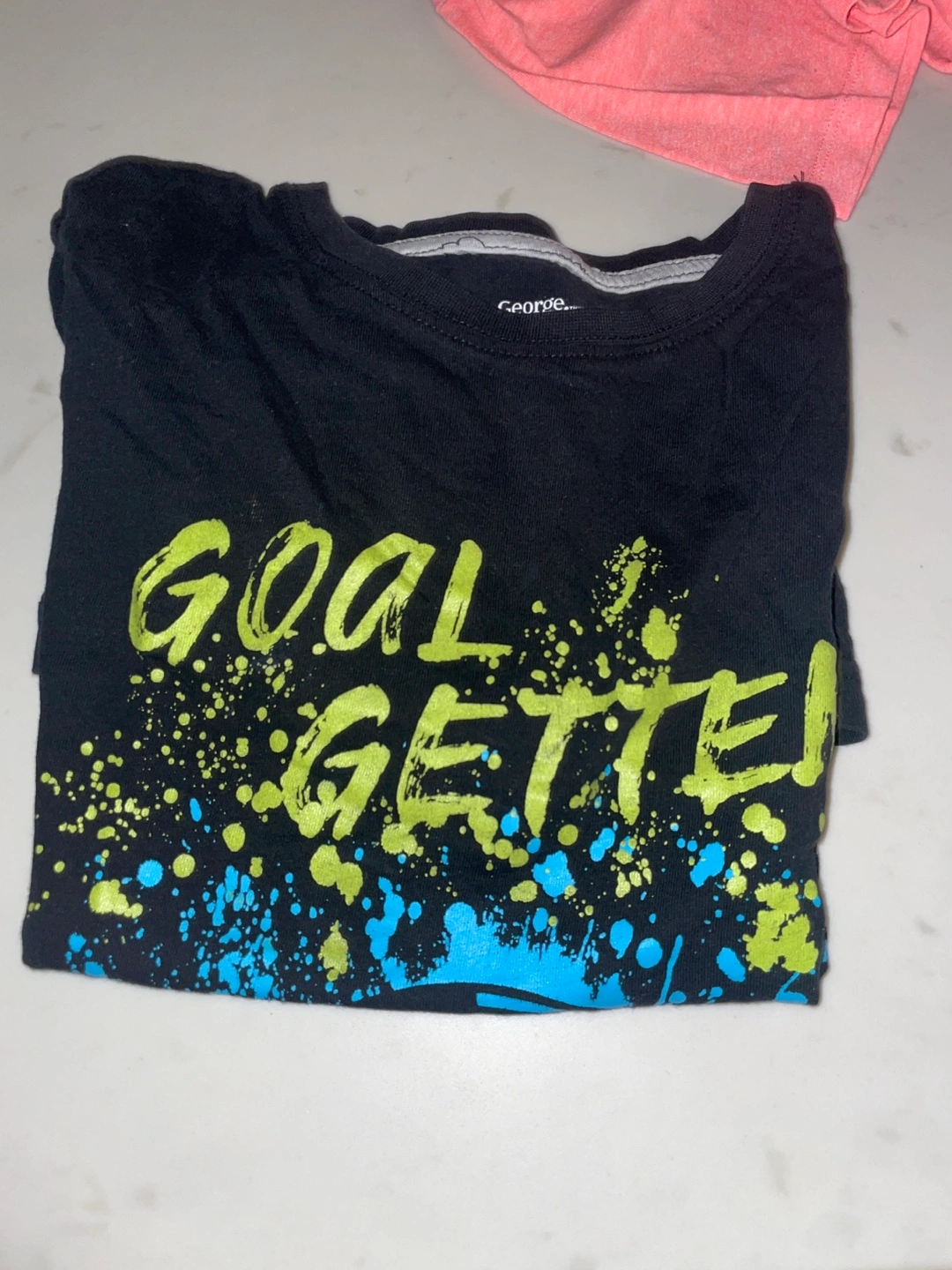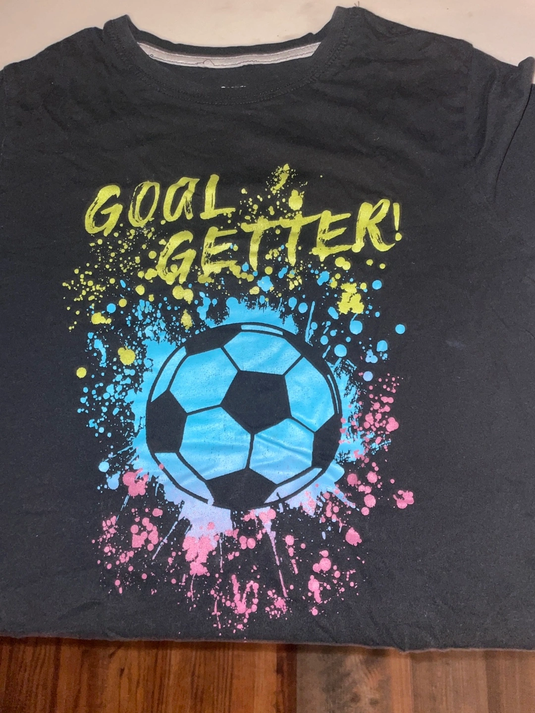 A cute George brand t-shirt with a fun "Goal Getter!" design. It's black with a soccer ball and colourful splatter paint design. Perfect for your little athlete!