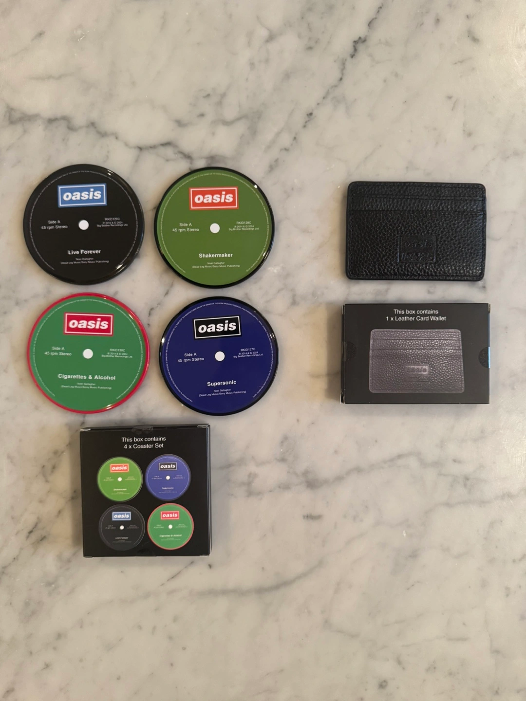 Comes with clear tote, 4 coasters, leather card wallet, Oasis guitar picks, Oasis scarf, bottle opener, vip concert lanyard, hand numbered oasis picture and keychain.