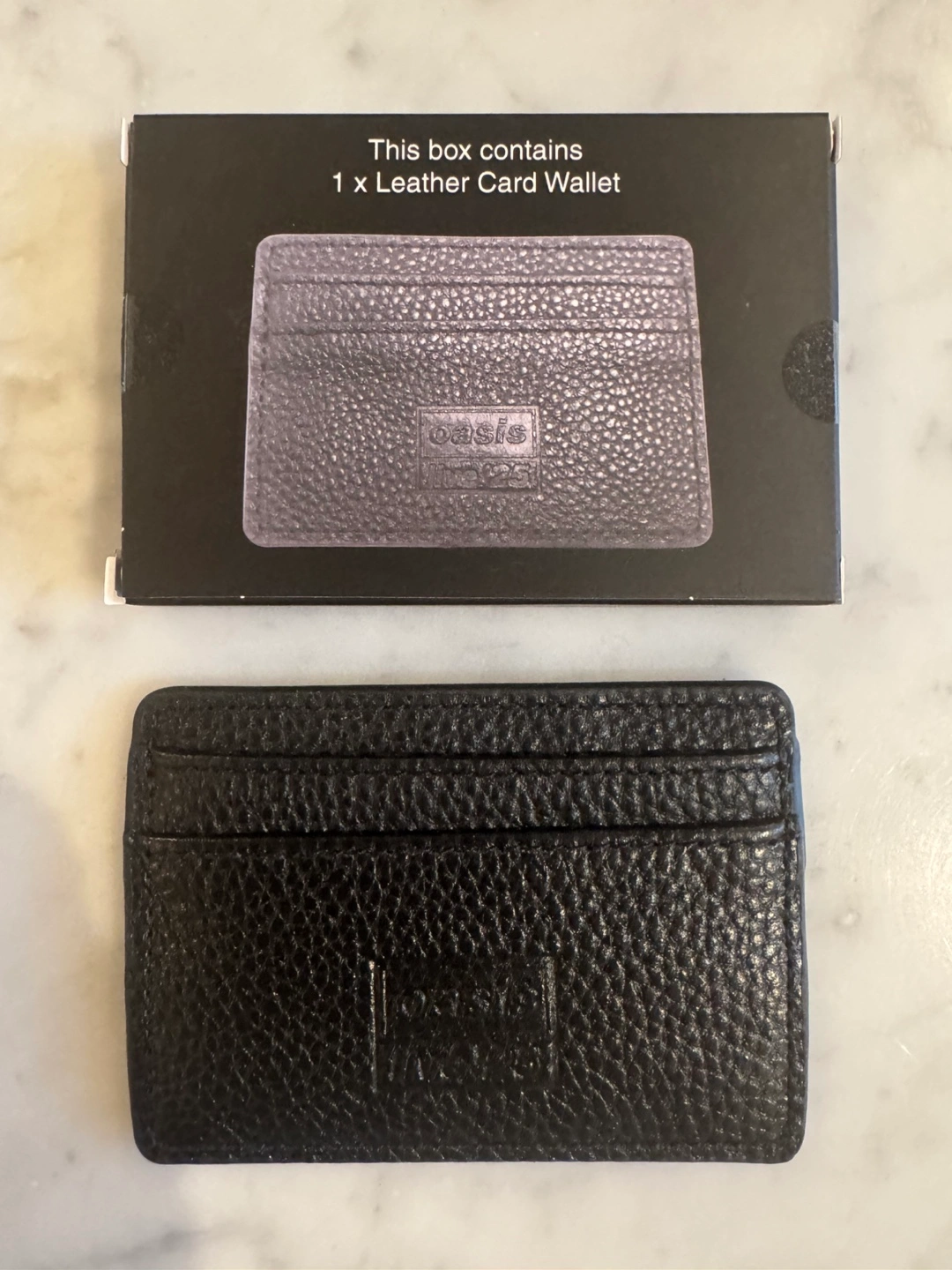 Comes with clear tote, 4 coasters, leather card wallet, Oasis guitar picks, Oasis scarf, bottle opener, vip concert lanyard, hand numbered oasis picture and keychain.