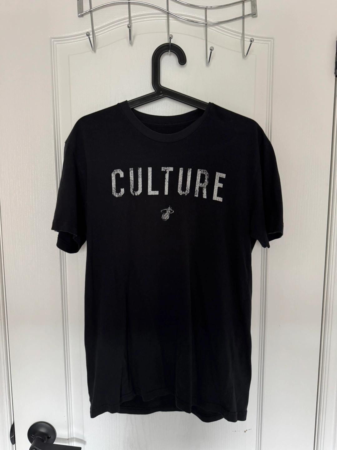 Selling a black Miami Heat "Culture" t-shirt. It's in good condition and ready for a new home! The shirt features the word "CULTURE" in white lettering across the chest, with the Miami Heat logo just below.