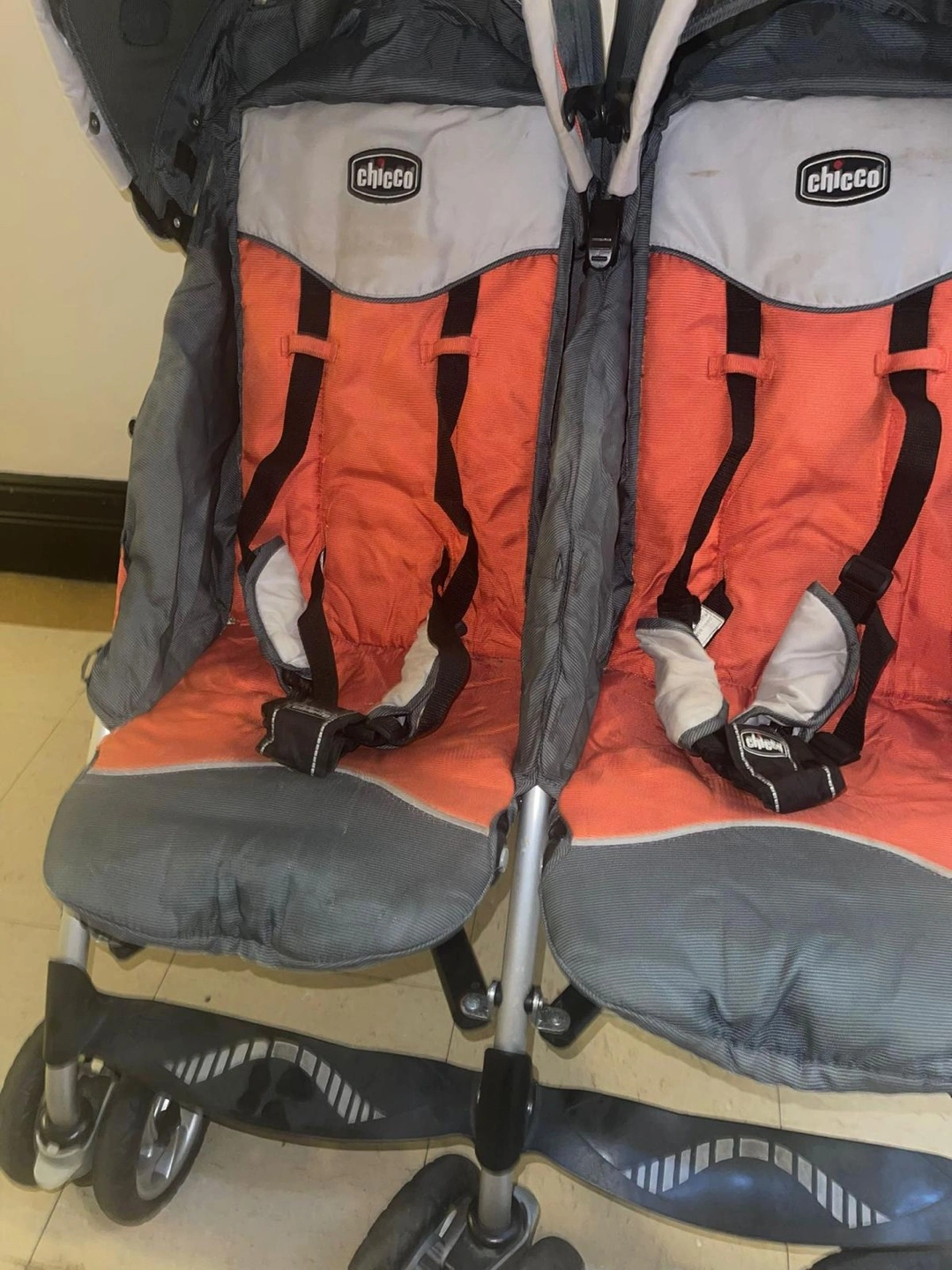 Selling a Chicco double stroller in orange and gray. It's in used condition but still has plenty of life left! Perfect for parents with two little ones. Chicco double stroller (made in Italy) can be washed in the washing machine and is quick to close in excellent condition, orange and grey colour, everything works very well