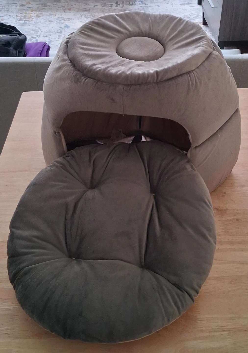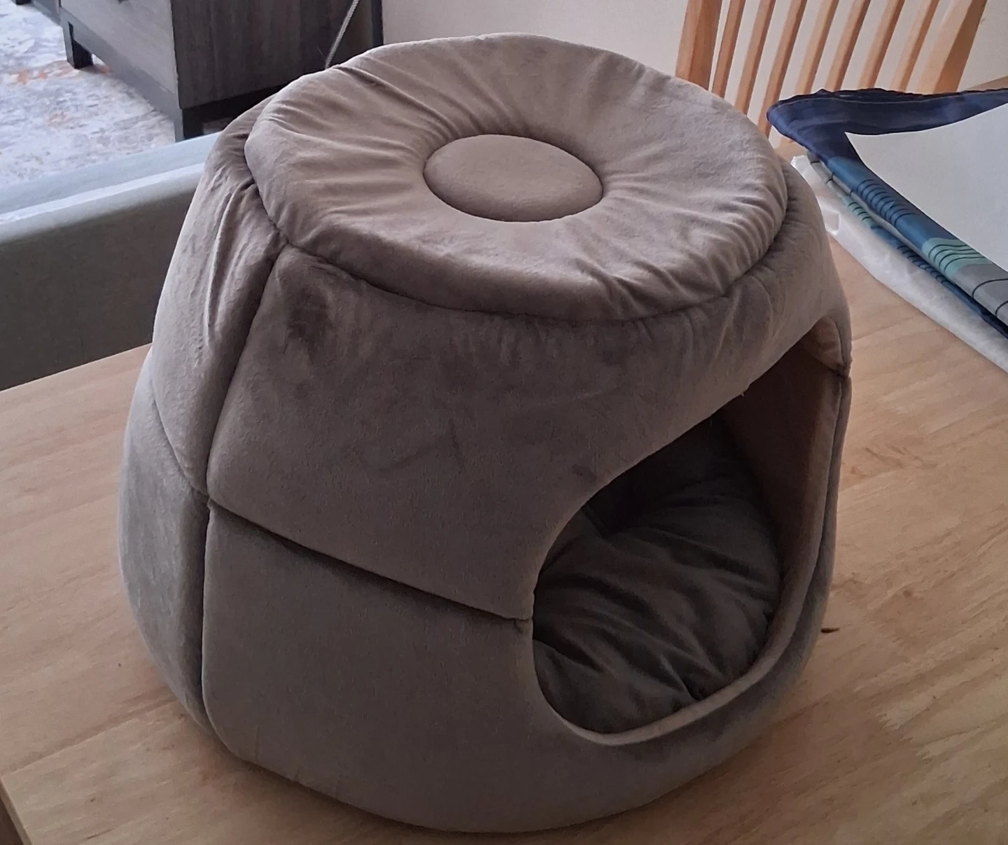 Soft, grey, plush pet bed house with a removable cushion. It's a cozy spot for cats or small dogs. This bed's enclosure offers a sense of security for pets. Dimensions are approximately 18" x 18" x 15".