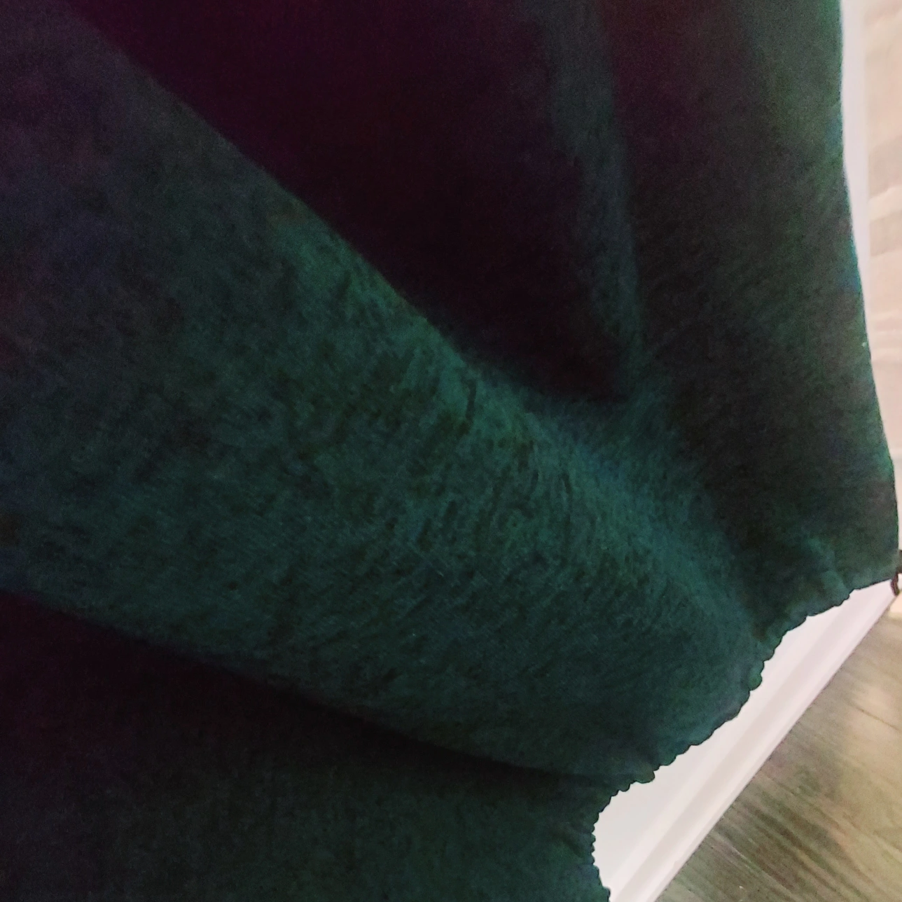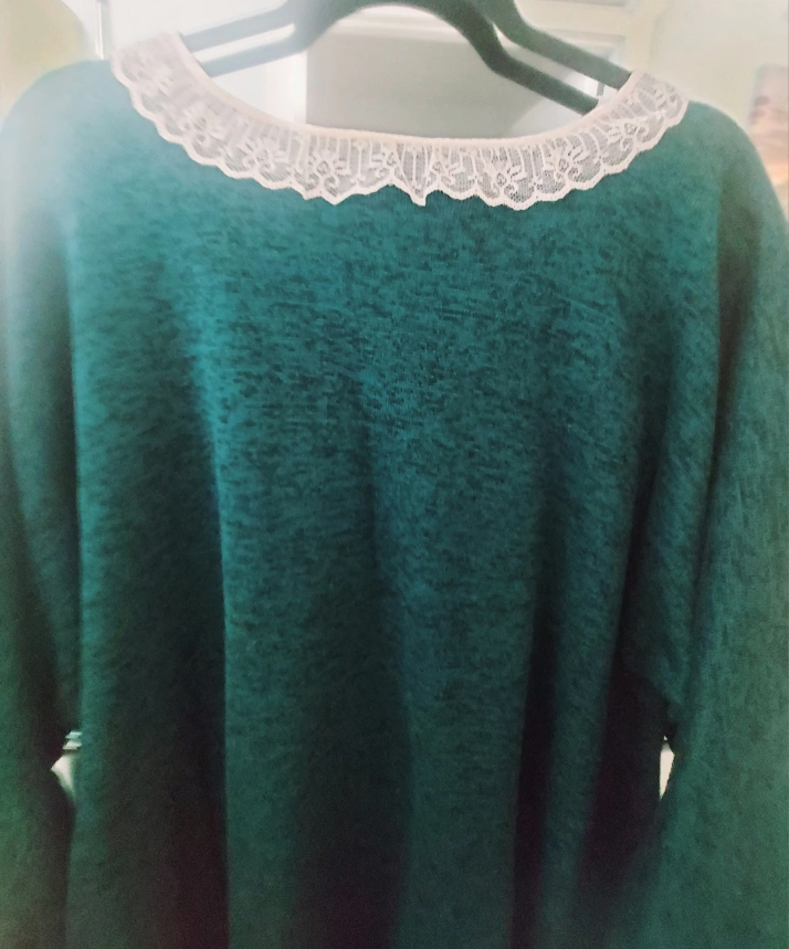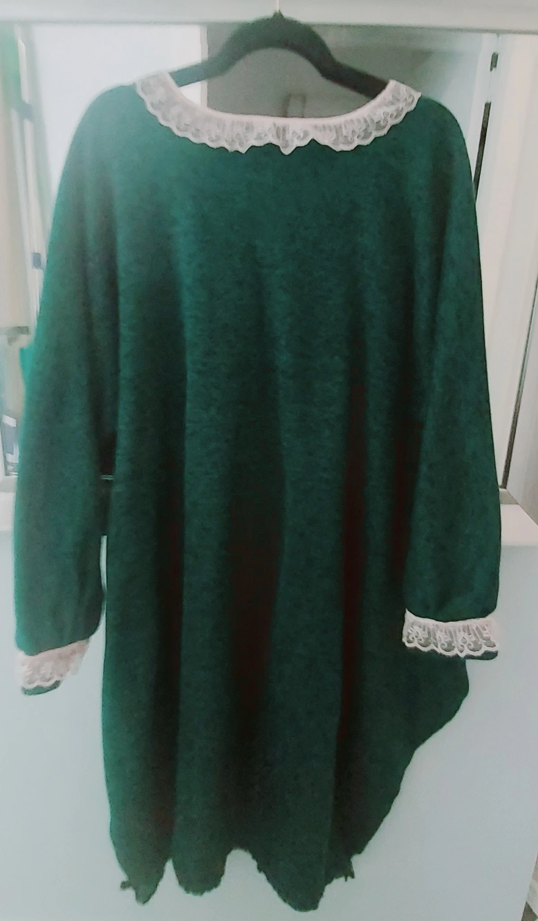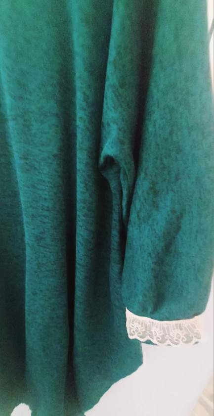 579This is a comfy fall / winter green long sleeve dress, perfect for layering or wearing on its own! It features a delicate lace trim around the collar and cuffs, adding a touch of elegance to the casual style