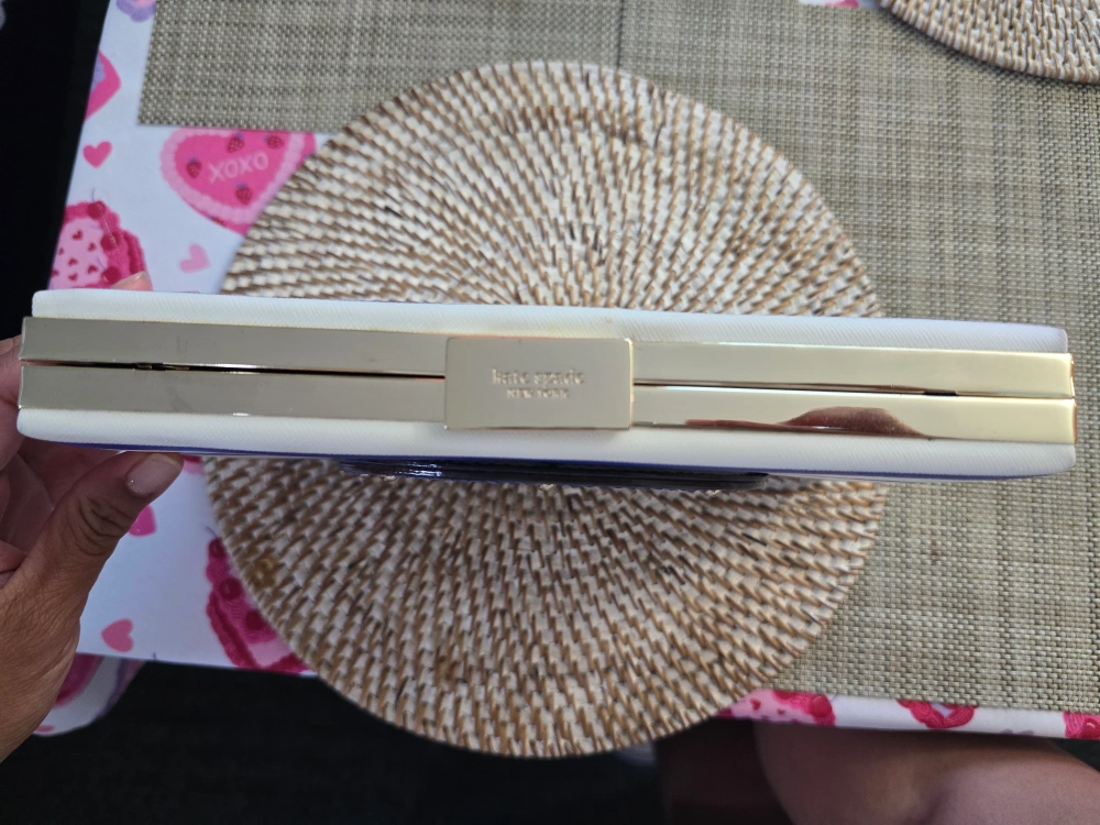 This Kate Spade clutch features a fun nautical theme with blue and white stripes and the phrase "Beware of Sharks"! The interior is a vibrant blue with a chain strap. It's a stylish and unique accessory for any outfit