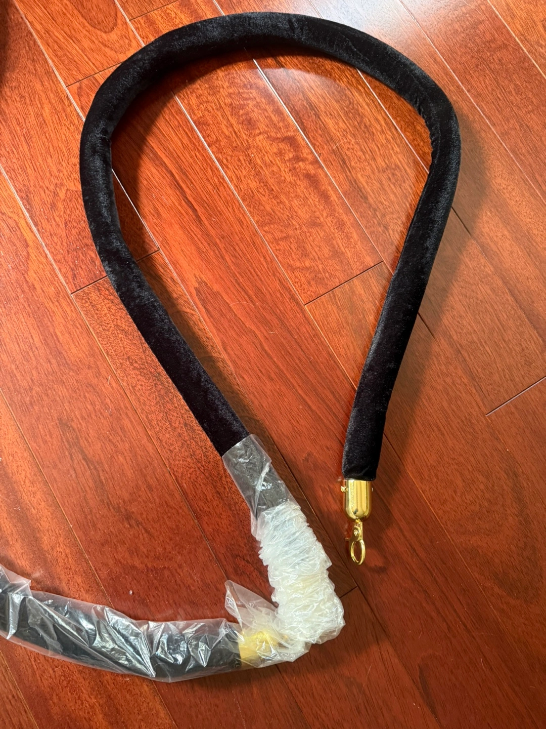 Selling 2 new black velvet ropes barrier! They are still in their original packaging. Perfect for adding a touch of elegance to any event or space. The ropes are classic black velvet with gold-tone hardware.